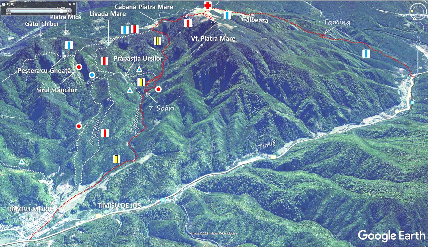 Traseu: Dâmbu Morii – Valea Șipoaia – Canionul 7 Scări – Cabana Piatra Mare – Vf. Piatra Mare – Culmea Gălbeaza – Valea Pietrei Mici – Cumea Carierei – Gura Pârâului Carierei
