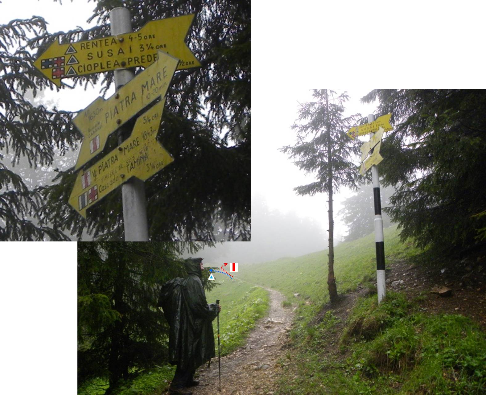 Apare, curând, destul de excentric, și un indicator care marchează intersecția celor două marcaje; de fapt, de aici pleacă o scurtătură spre Cabana Piatra Mare, ce evită vârful !