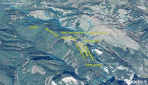 – Șaua Cupașului (conform Emilian Cristea), de unde, urmând spre sud linia interfluviului Lapoș-Cupaș, se ajunge în … Șaua Cupașului, conform hărții Dimap din 2002, iar de aici, mai departe, pe …