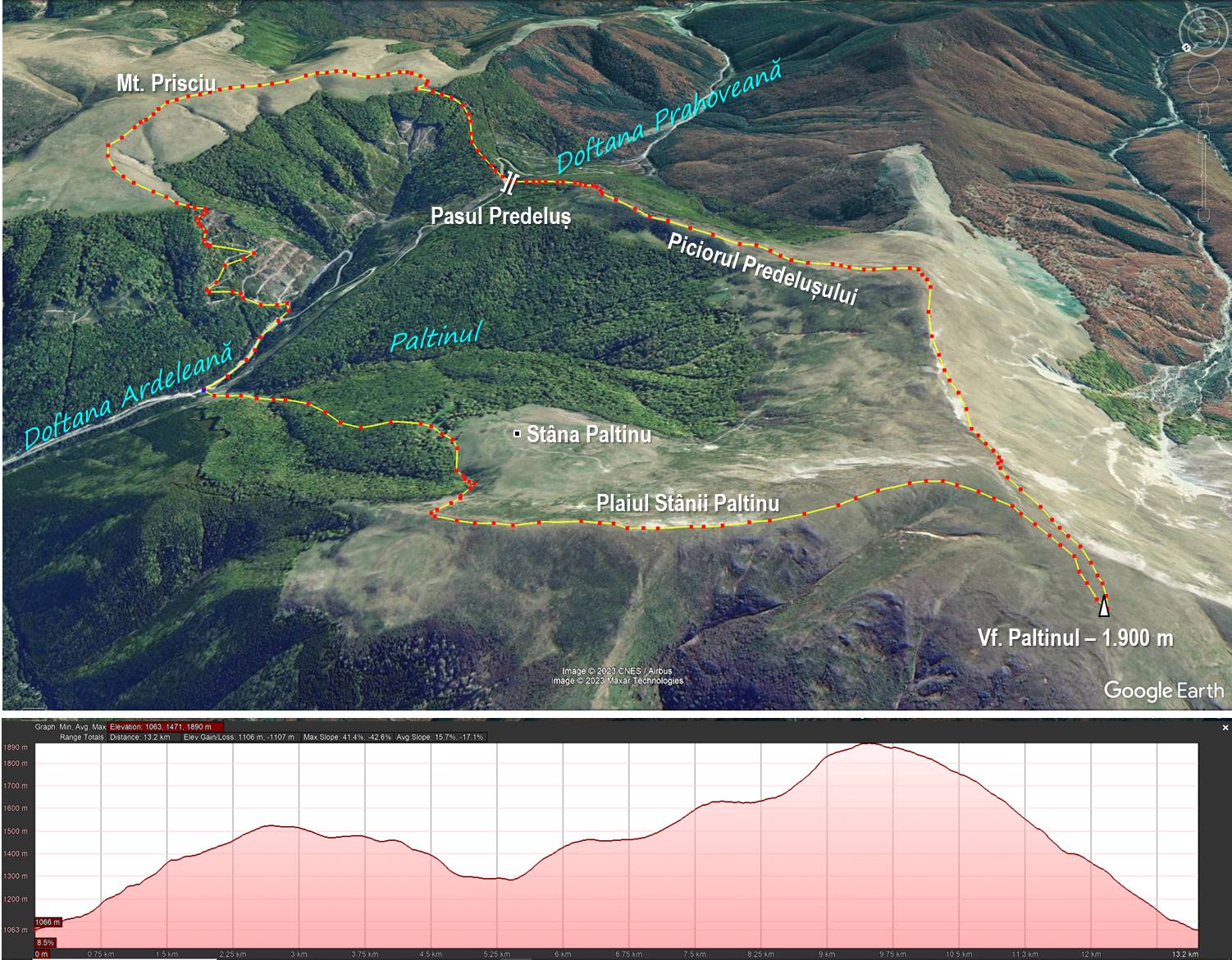 Traseu: SĂCELE (Valea Doftanei – Gura Paltinului) – Mt Prisciu – Pasul Predeluș – Piciorul Predelușului – Vf. Paltinu – Culmea Stânei Paltinu – Stâna Paltinu – Gura Paltinului