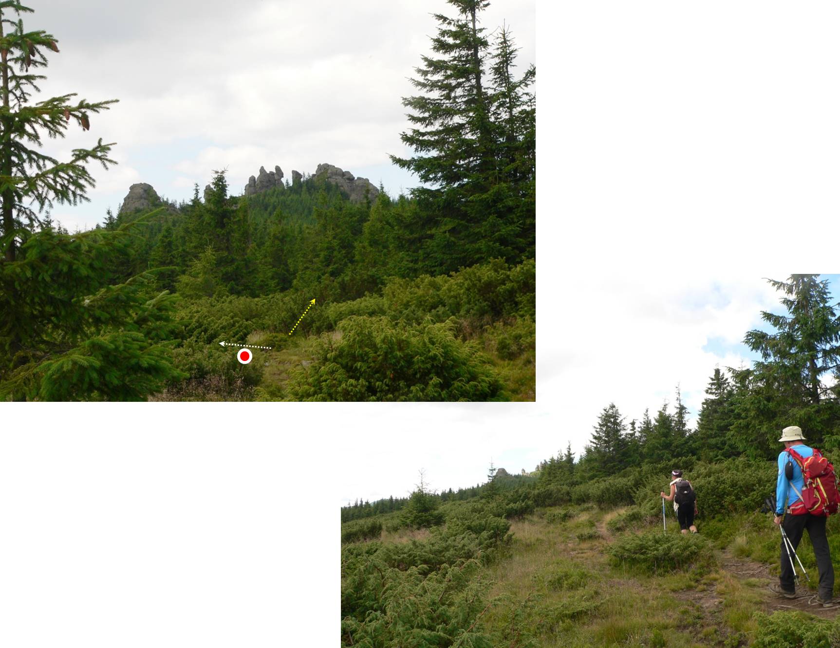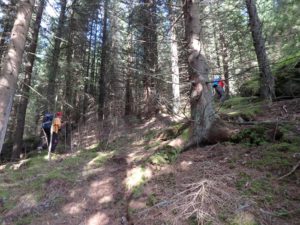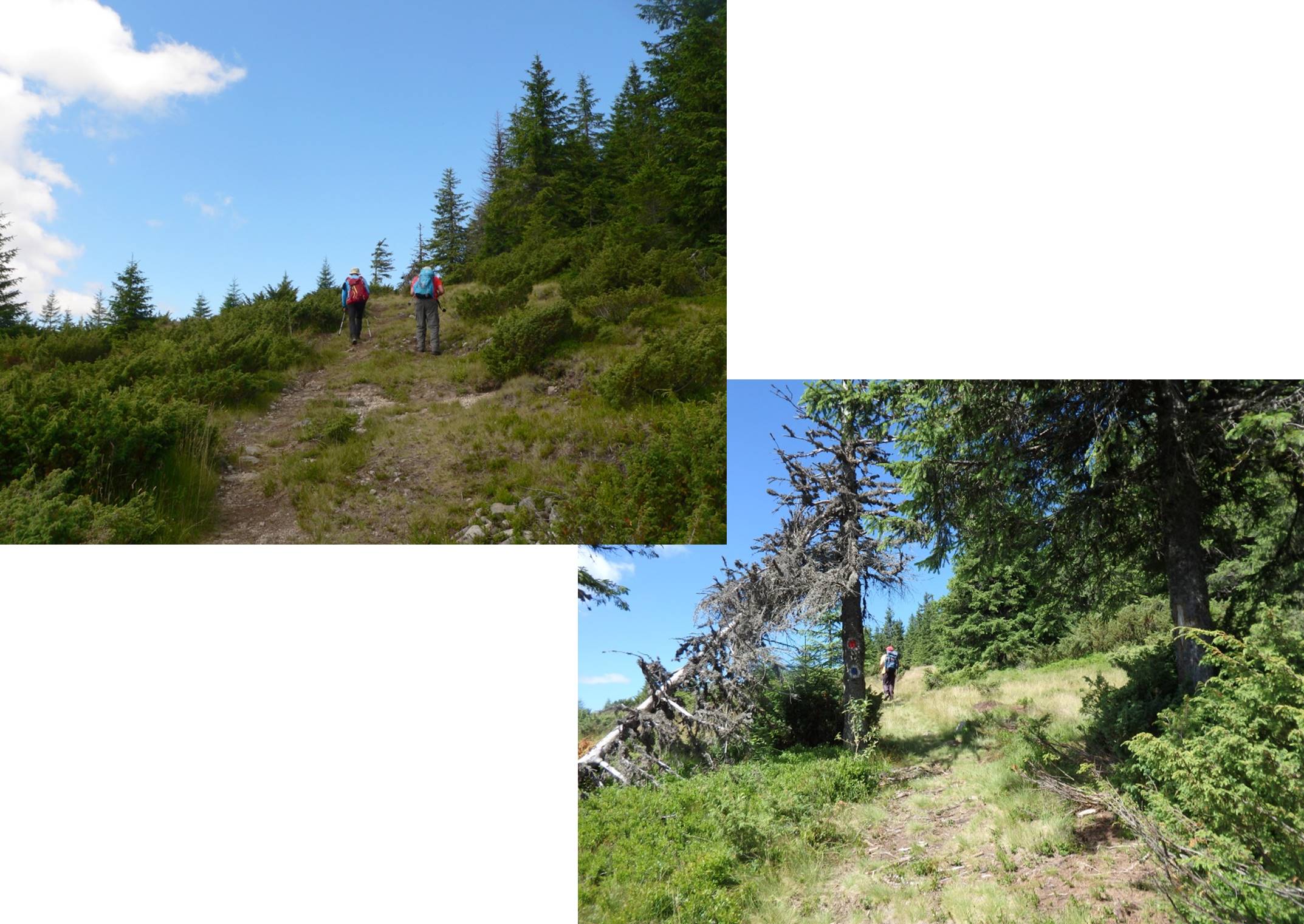 Sus, întâlnim semne ce marchează culmea Lucaciului; în prezent, conform hărților, doar punctul roșu a rămas … în vigoare, urmând, se pare, o variantă ce evită vârful Lucaciului. Noi țintim însă vârful; …