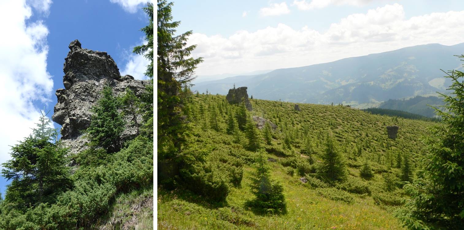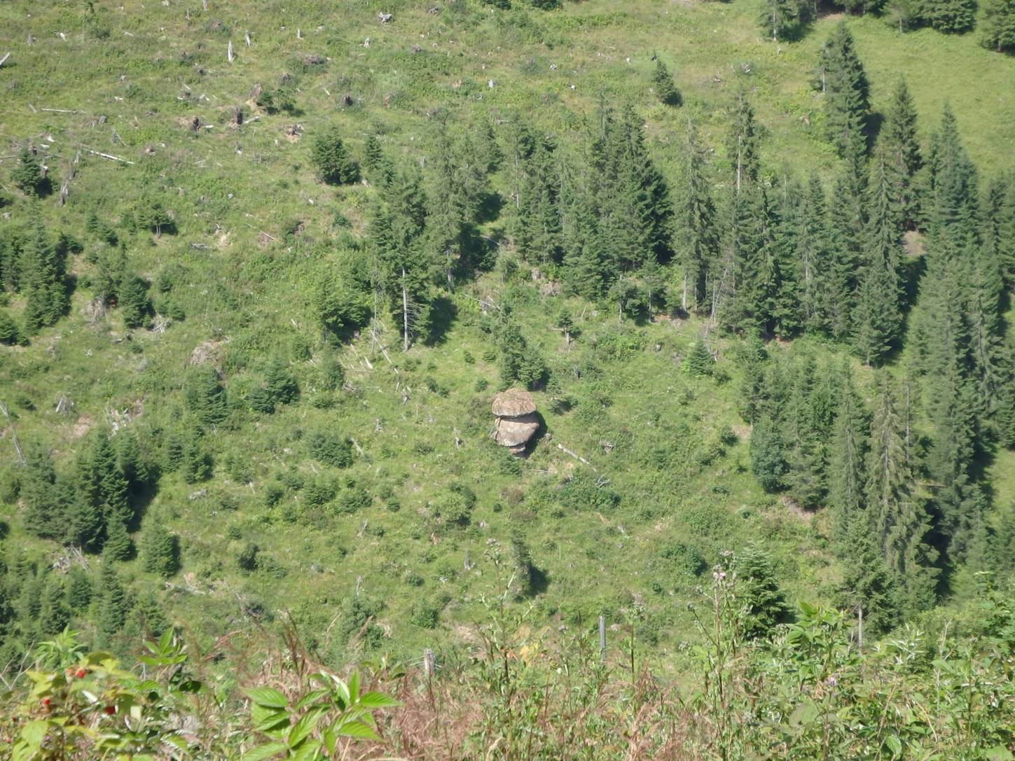 Drumul de culme se hotărăște brusc să renunțe la ea, pentru a coborî în valea Jidanului; ne convine, atrași de o imagine insolită: …