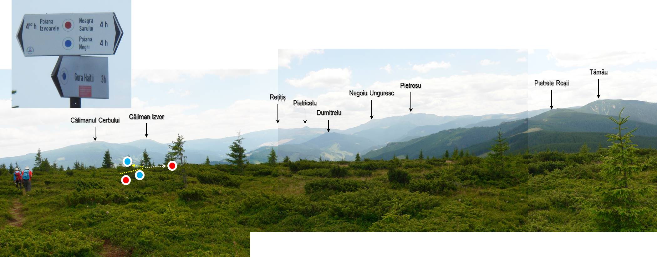 – harta Parcului Național Călimani indică doar prezența punctului roșu pe această porțiune; pe teren însă apar, sporadic, și puncte albastre !