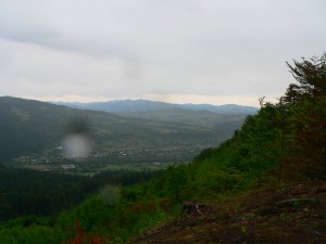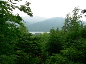 Privind prin (semi)fereastra din şaua ce precede Plaiul Rugetului, din spatele unei perdele de ploaie, spre Lacul Valea Uzului, dominat de Piciorul Arsurii;