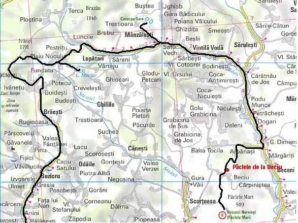 3. Pensiunea Vulcanii Noroioşi – Beciu (comuna Scorţoasa) – Vulcanii Noroioşi de la Beciu – Tabăra Arbănaşi – Mărgăriţi (comuna Beceni) – Vintilă Vodă – Mânzăleşti – Complexul carstic salin Meledic – Mânzăleşti – Lopătari – Luncile (comuna Lopătari) – Plaiu Nucului (comuna Lopătari) – Lacul Mociaru – Plaiul Nucului – Brăeşti – Pârscov – Măgura – Pensiunea Vulcanii Noroioşi