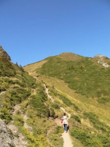 Ne grăbim să coborâm; poteca pastorală pe care o urmărim destul de greu, …