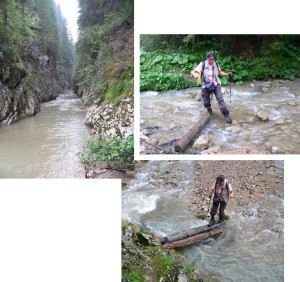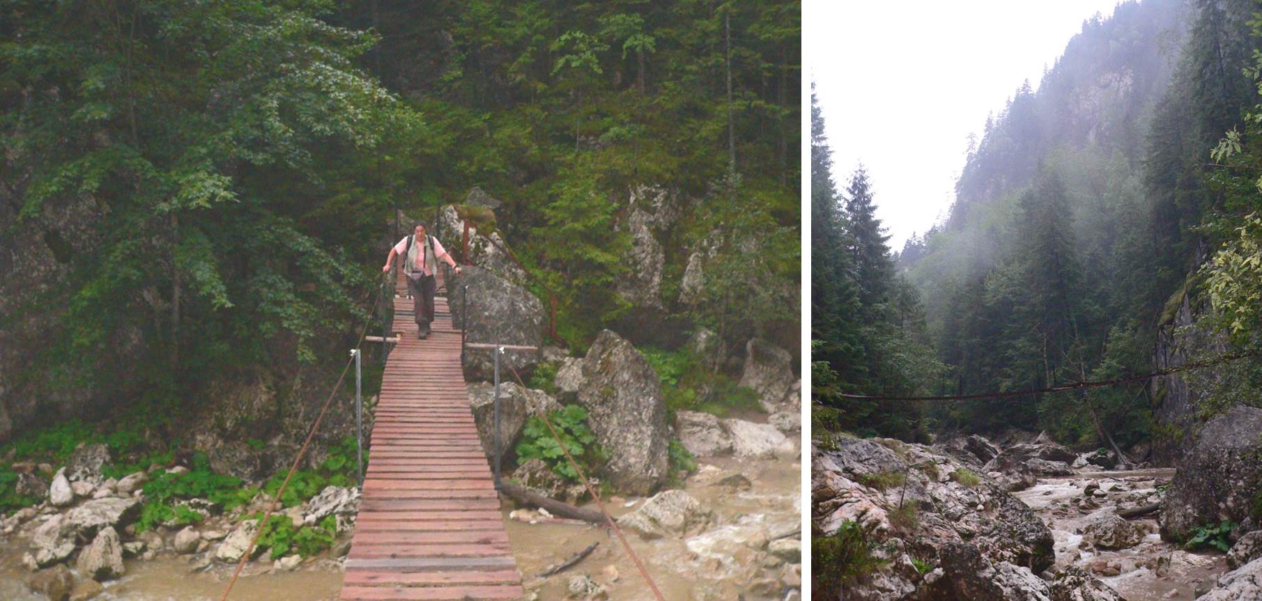 Aventura traversării – oficiale, pe poteca marcată – a cheilor începe cu … traversarea Bicăjelului pe un pod suspendat …
