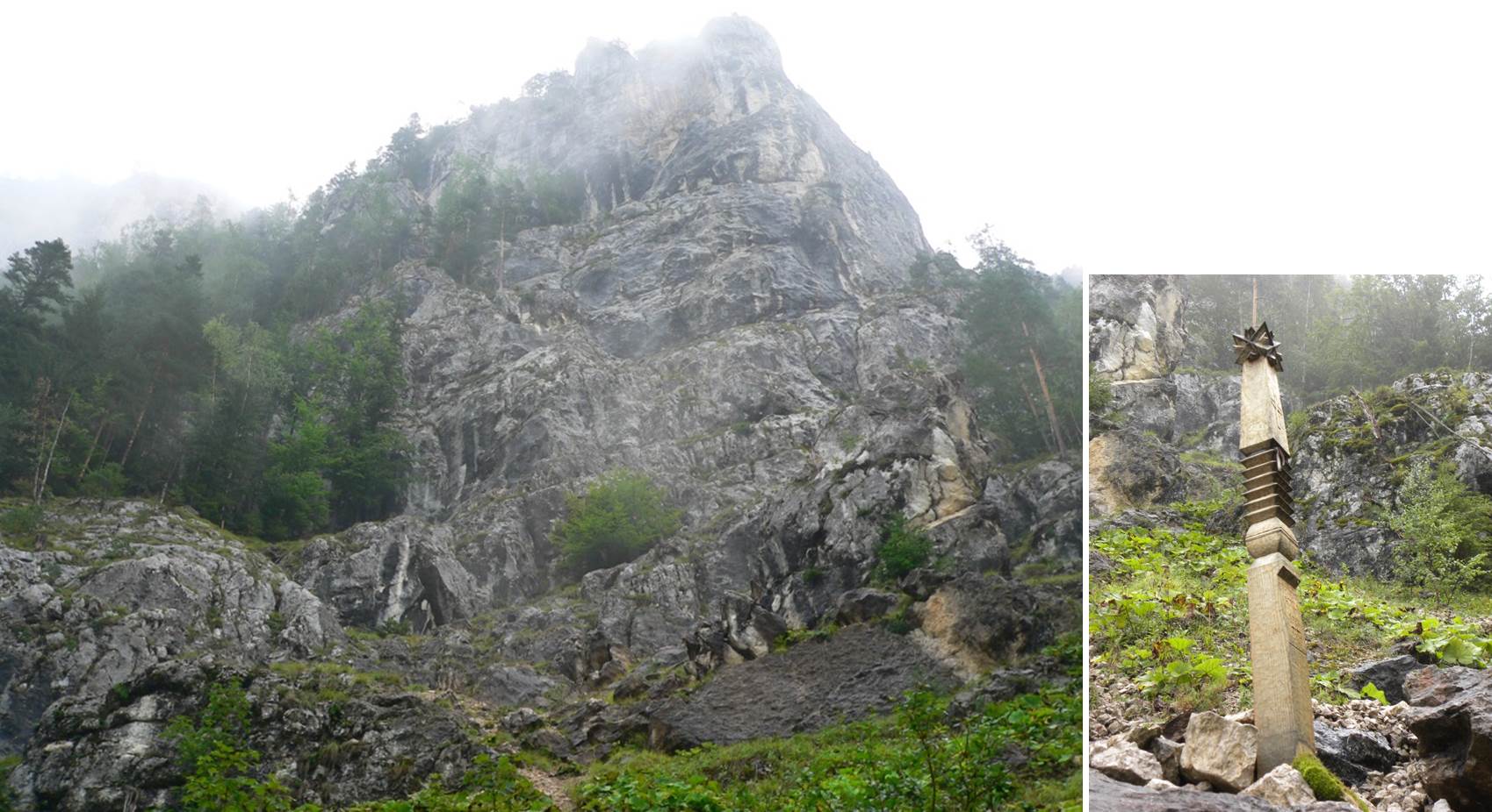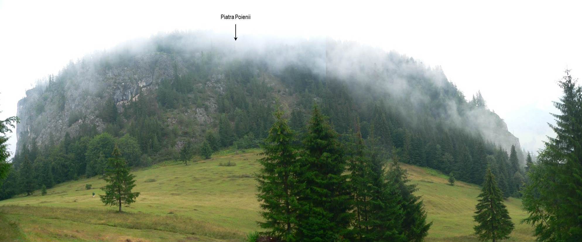 Poteca-alee ce coboară din șa are un moment de … spectacol, când trece pe sub peretele nordic al Pietrei Poienii – unul dintre clasicele … terenuri de alpinism ale Cheilor Bicazului: un monument amintește de una dintre victimile acestei … pasiuni !