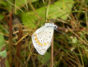 Polyommatus icarus – mascul, este albăstrui pe fața superioră a aripilor.