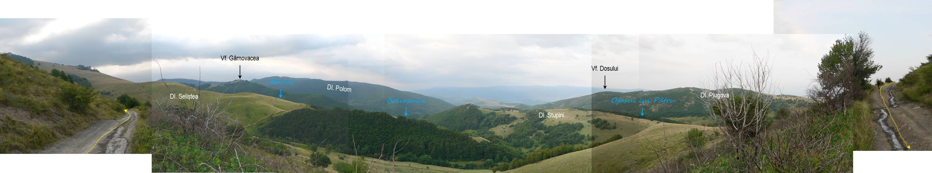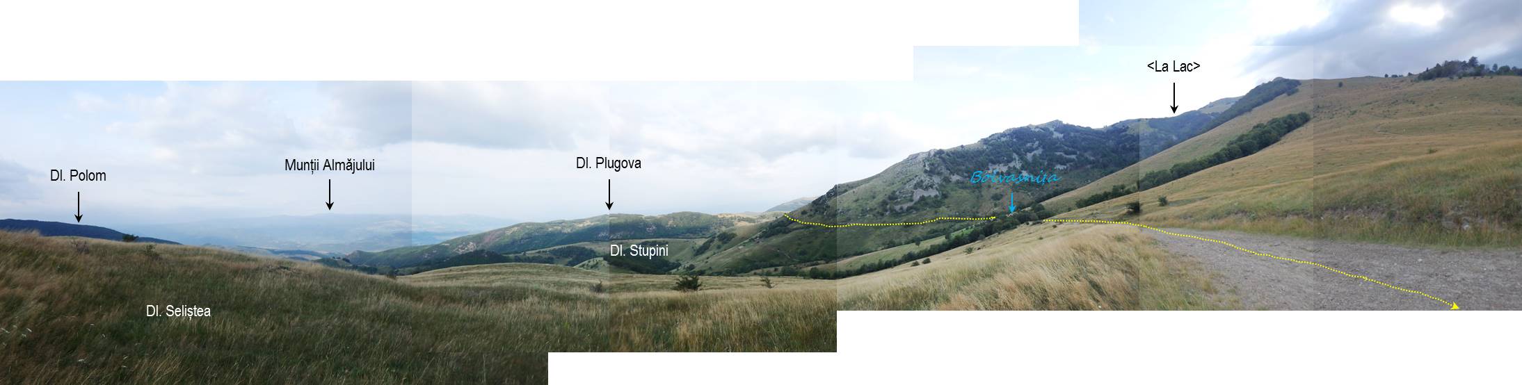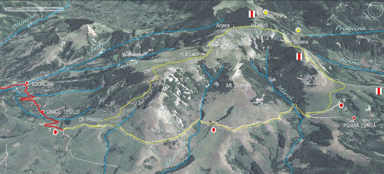 Ținem spre vest mediana șeii – vastă cumpănă de ape între izvoarele Bejaniei (>Vârtopu>Belareca) și Bolvașniței – …