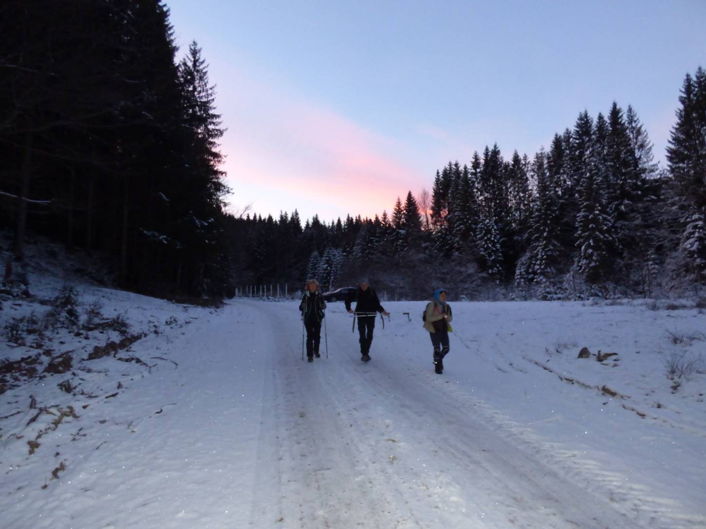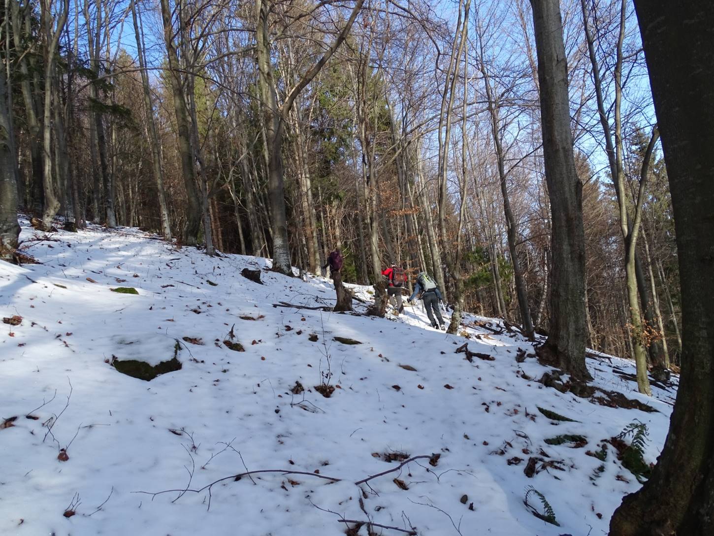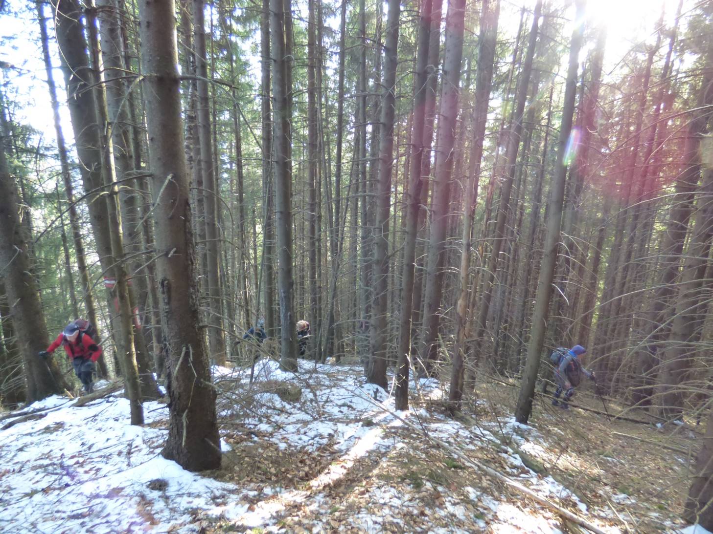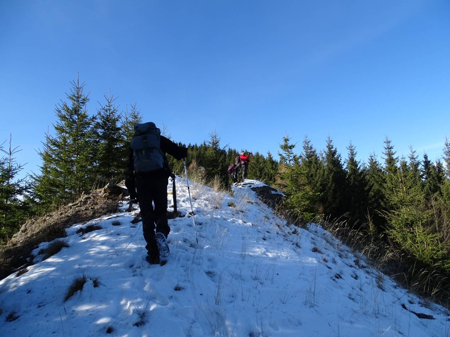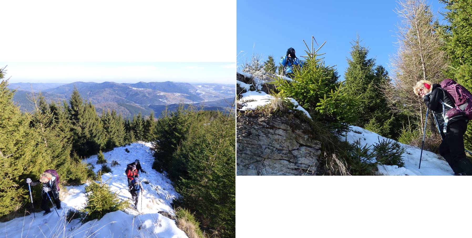 Ne întoarcem … spre unde am venit, mergând de-a coasta, până prindem coama Muntelui Hălăuca, marcată cu bandă roșie silvică, …