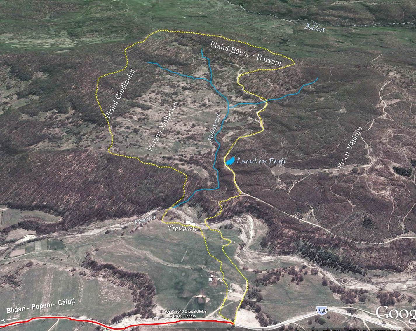 De fapt, lăculețul n-a fost tocmai o surpriză, căci “plimbărica” era special aranjată pentru a-l vedea; aflaserăm că există de la un cioban de pe Dealurile Borșanilor și tot de la el i-am aflat numele – Lacul cu Pești – și, cu aproximație, locația. A fost, apoi, simplu să-l localizăm cu precizie pe Google Earth !