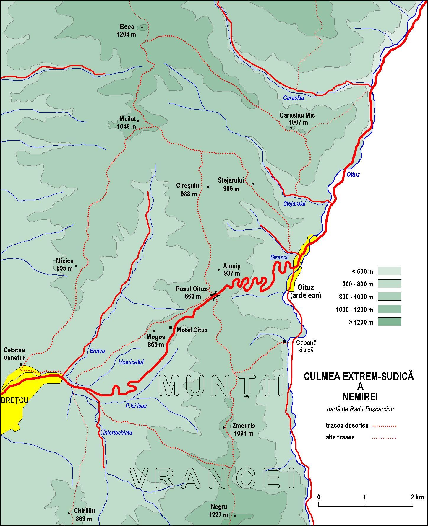 De la motel ne îndreptăm, pe şosea, spre Breţcu, dar, după circa 150 m, din dreptul podului peste pârâul Întortochiat – care, după ce trece pe sub el, primeşte din dreapta, ca afluent, pârâiaşul Voinicelul – ieşim de pe şosea pentru a prinde drumul de căruţe de pe versantul drept al văii Voinicelului, interfluviu între această vale şi cea a pârâului Breţcu. După un sfert de oră ajungem la marginea unei păduri de molid, de unde trecem pe drumul forestier aflat în stânga noastră. Mergem pe acest drum vreo 10 minute doar, timp în care lăsăm în dreapta un braţ al drumului ce se duce spre firul văii Voinicelului. Curând, drumul se bifurcă, noi optând pentru ramura stângă a lui, care urcă uşor, până într-o mică poiană, de unde urmăm spre dreapta un drum de exploatare ravenat ce se avântă în urcuş pe Dealul Mogoş; străbatem, timp de un sfert de oră, o pădure tânără de molid, drumul terminându-se când ajunge sub o linie electrică de medie tensiune. În acest punct urcăm panta abruptă din dreapta noastră circa 10 metri pentru a da de un fost drum de exploatare, cucerit acum de molizii plantaţi în locul pădurii ce ocupa versantul vestic al Mogoşului şi tăiată cu ani în urmă. Drumul ne plimbă de-a coasta pe tot versantul vestic al Dealului Mogoş, scoţându-ne pe cel nordic, în marginea pădurii de molid şi, din nou, sub linia de medie tensiune. Şoseaua naţională este la doi paşi în dreapta noastră. Vom merge pe lângă ea, până în Pasul Oituz, pe un drum de căruţe ce-i taie serpentinele. Din pasul Oituz, intrăm pe traseul de creastă al Carpaţilor, marcat, doar teoretic în sectorul pe care îl vom străbate, cu bandă roşie. Pasul Oituz este evidenţiat de prezenţa unei cruci de lemn, dar mai vizibilă este o antenă GSM. Traversăm şoseaua, şi continuăm pe un drum forestier. Trecem prin poiana plată ce constituie şaua de racord dintre munţii Vrancei şi cei ai Nemirei, apoi printr–o mică pădurice din care ieşim într-o largă poiană. La marginea sa nord-estică există un adăpost din scânduri folosit de păstori; poate fi luat în considerare în eventualitatea unui popas, mai ales iarna, deoarece poiana în care se află reprezintă o adevărată … atracţie pentru vânturi. Traseul continuă, tăind poiana pe direcţia sud. Drumul şerpuieşte larg prin rarişti de pădure şi poieni cu fâneţe. Evităm, după 5 minute de la părăsirea poienii “cu adăpost”, să fim atraşi de un braţ lateral al drumului care pleacă spre stânga, către o altă antenă GSM. Chiar de la intersecţia cu pricina, drumul nostru are tendinţa de a ne duce spre dreapta, şi chiar o face, doar pentru a ocoli însă obârşia unei văi, afluent al Oituzului. După ce (printr-o largă deschidere spre vest, oferită de o zonă acoperită cu fâneţe, traversată de linia de înaltă tensiune) vedem imaginea motelului Oituz aflat la marginea şoselei naţionale, pătrundem într-o poiană închisă de jur împrejur de pădure. Drumul forestier iese prin sud-vestul ei, punct diametral opus celui prin care am intrat. Urcăm uşor, trecând printr-un colţ de pădure de molid, şi, la capătul suişului ne intersectăm cu un drum transversal, pe care continuăm să mergem spre dreapta, lăsând în stânga şi ceva mai sus platouaşul somital al Piscului Lin. În lipsa marcajului turistic ne mulţumim cu cel forestier, format din două benzi verticale roşii (hotar între districte sau unităţi de producţie). Curând drumul nostru se pregăteşte să atace un prim vârf, destul de serios, al Dealului Zmeurişului. N-o face însă frontal, ci pieziş, pe versantul stâng, estic, al vârfului, arcuindu-se până într-o şa de dincolo de el, de pe versantul sudic. Suntem pe un plai acoperit de o păşune fragmentată de pâlcuri de arbori. Drumul se ţine, iniţial, de latura estică a plaiului până ce depăşim înălţimea maximă a Dealului Zmeurişului. Imediat apoi drumul se instalează pe mediana culmii. Ocolim două obârşii tributare bazinului pârâului Breţcu, între care se formează picioare laterale ale căror racorduri la culmea principală formează îngheboşări. Trecem pe lângă câteva sălaşe pastorale aflate aproape de pădurea din marginea din dreapta a păşunii. De aici, drumul coboară puţin, pentru a ocoli coada unei văi îndreptate spre bazinul Oituzului, apoi urcă spre racordul cu un picior direcţionat tot spre vest. Ajunşi sus, avem în faţă o şa largă, relativ joasă, impresie întărită de semeţia Muntelui Negru care se înalţă brusc dincolo de ea. Continuăm pe culmea pleşuvă a piciorului din dreapta, pe un drum de exploatare. Nu durează mult, şi din prima şa – joasă şi poienită – drumul părăseşte culmea coborând spre valea din stânga. Noi traversăm şaua, recuperăm din înălţime şi ne instalăm pe linia culmii împădurite de-acum. Mergem pe o cărare lată, urmând un fost drum de exploatare cam estompat de litiera pădurii. Orientarea ne este facilitată de benzile roşii verticale ce marchaeză un hotar silvic între două parcele. Din dreptul bornei silvice II 166 coborâm brusc o mică treaptă, şi schimbăm direcţia cu 90 de grade spre dreapta. După un sector orizontal pătrundem într-o parcelă defrişată recent, pe care o traversăm, pe latura sudică, de sus, fără a schimba direcţia. Virăm cu 90 de grade şi continuăm pe latura vestică, luând-o în jos, dar, în scurt timp, ne redirecţionăm spre stânga, cu aproape 180 de grade, şi tot în coborâre, dar ceva mai pieziş. După ultimul cot, drumul se bifurcă. Alegem braţul stâng, ravenat şi ieşim rapid din pădure, la marginea unei păşuni în pantă. De aici ni se oferă panorama extremităţii nordice a Depresiunii Breţcului, pe unde pătrunde şoseaua naţională după ce coboară de pe Muntele Mogoş. Coborâm prin păşune, orientandu-ne spre st