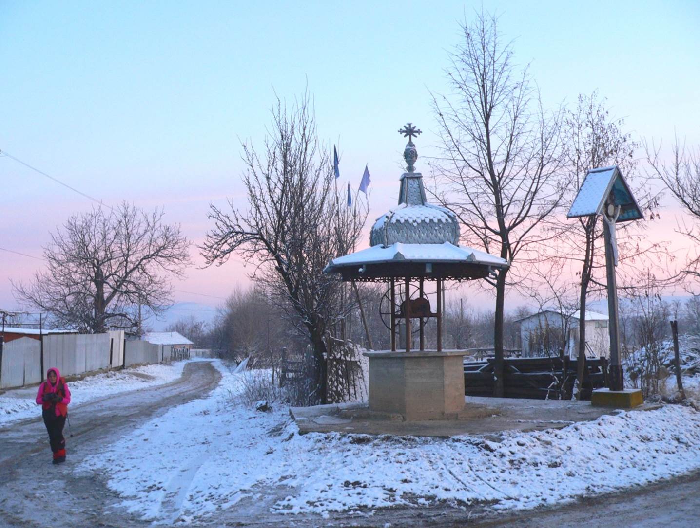 … după ce trece pe lângă o troiță atașată unei fântâni cu acoperișul din tablă lucrat cu multă migală, …