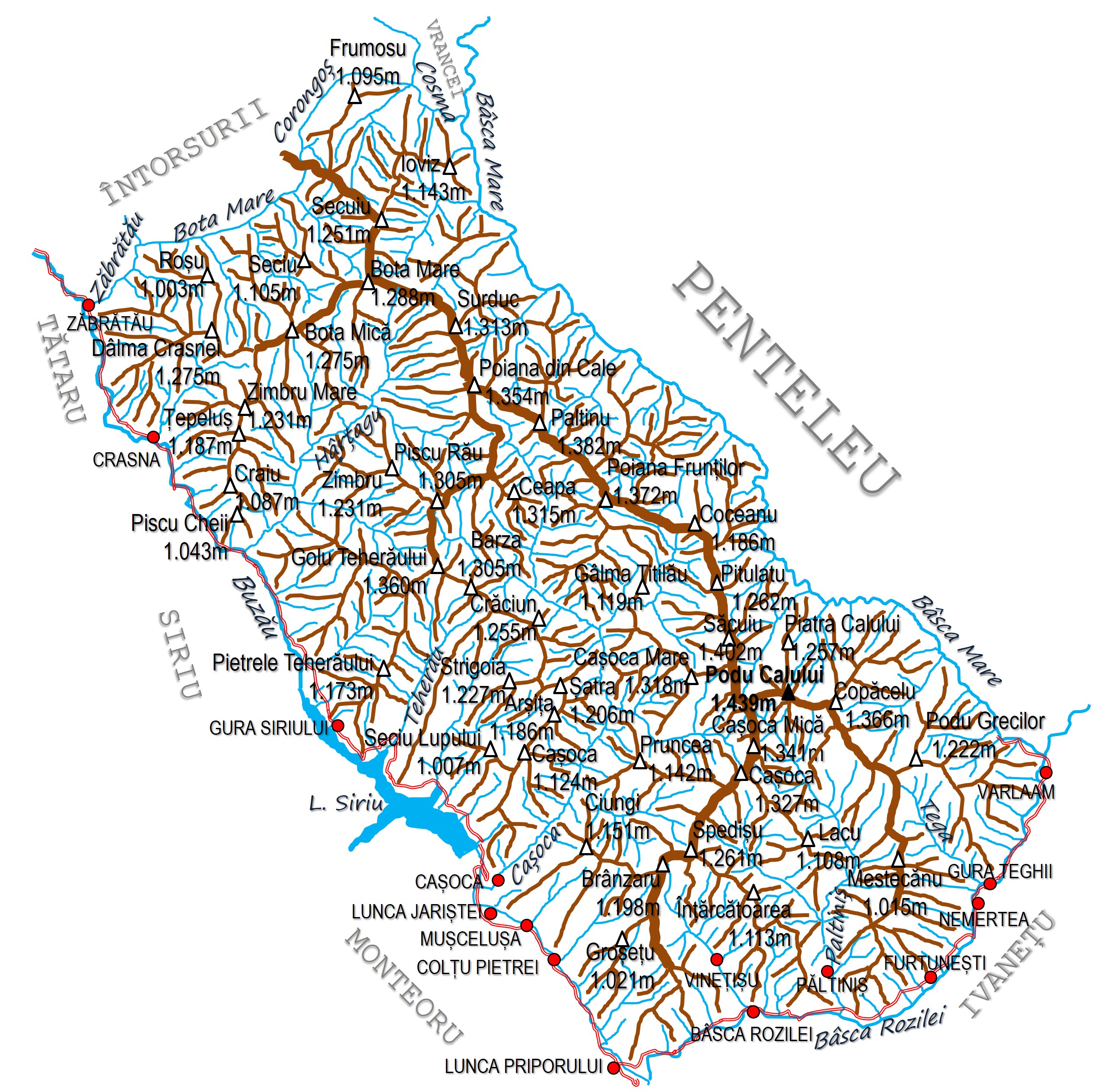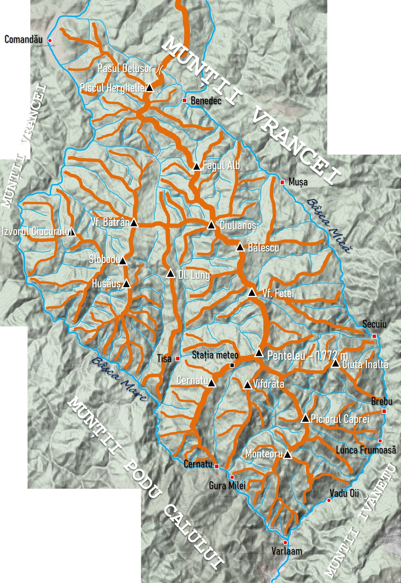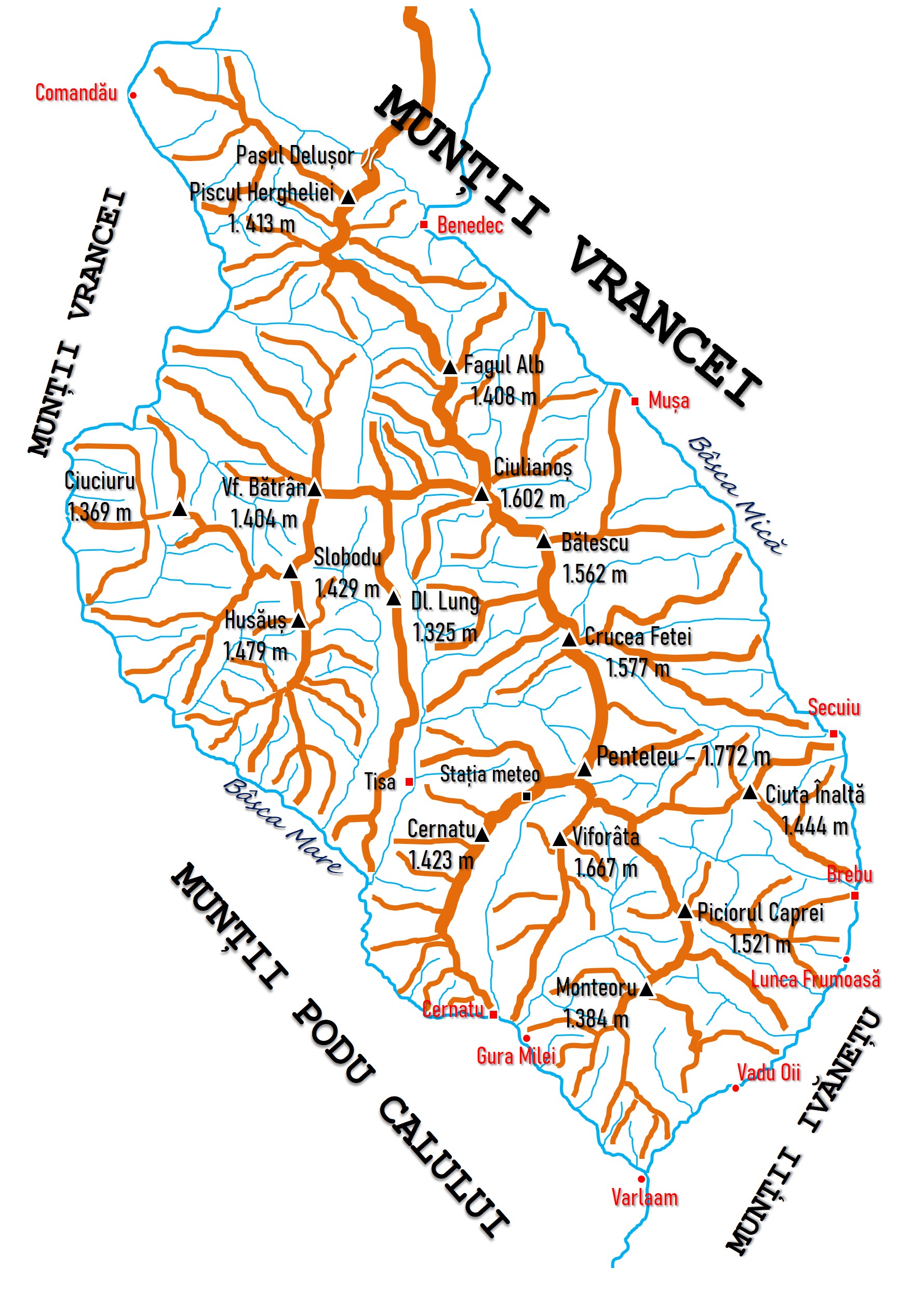 Din culmea principală se desprind câteva brațe cu înălțimi sub media (1.600 m) celor ale culmii principale: Husăuș, Cernatu, Viforâta, Monteoru !