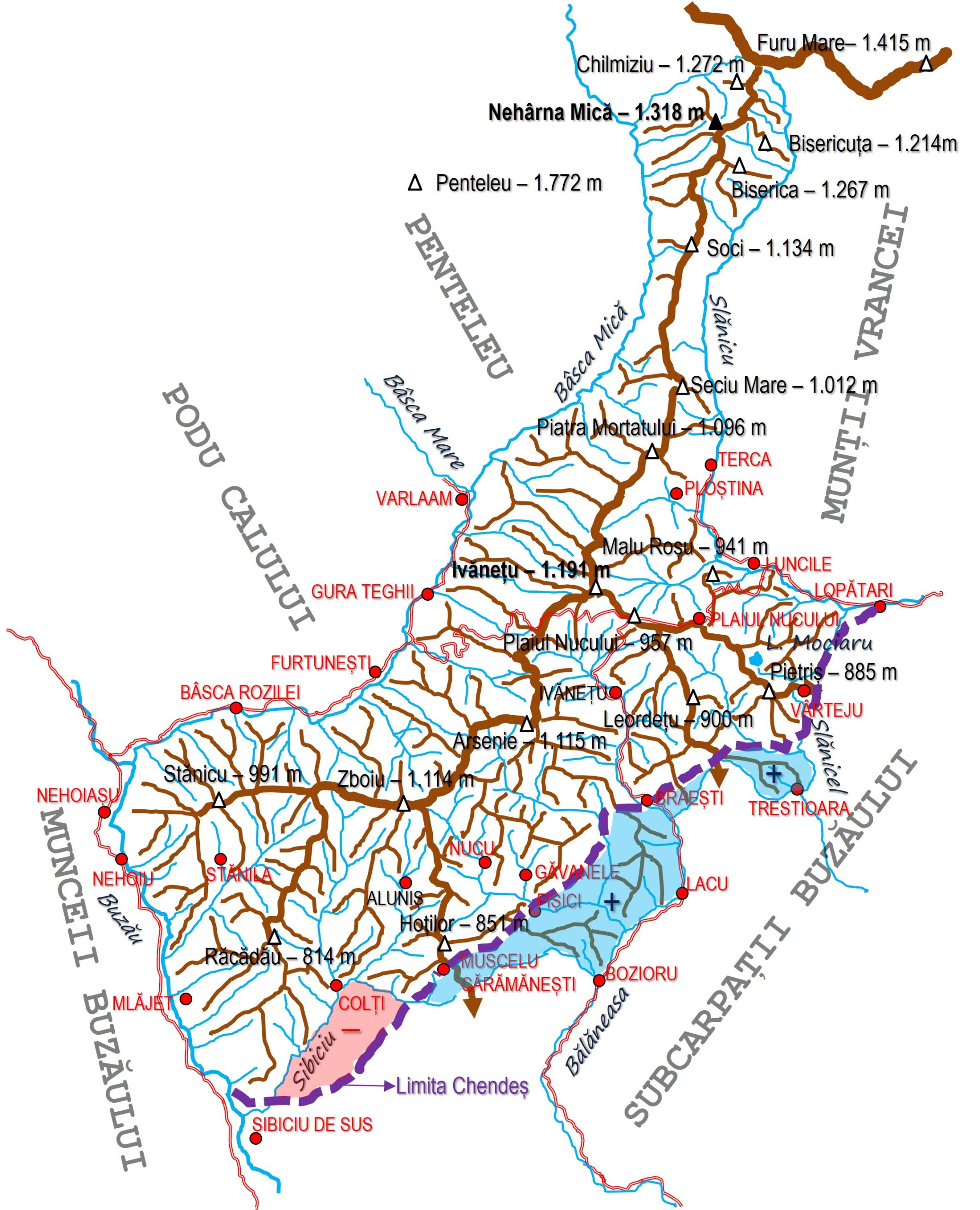 Noi am adoptat de punctul de vedere al geografului V. Chendeș în teza sa de doctorat (Scurgerea lichidă și solidă în Subcarpații de la Curbură, Institul de Geografie al Academiei Române, 2007), unde alocă un capitol special stabilirii limitelor și subunităților Subcarpaților de la Curbură. Doar că noi, consecvenți principiului adoptat de-a lungul demersului nostru privind regionarea Carpaților Orientali, de a păstra continuitatea morfologică a culmilor, evitând fragmentarea lor excesivă, astfel că hotarul dintre (macro)structuri urmează cursuri de apă, am stabilit câteva (micro)limite ce exced “limita Chendeș”, eliminând sau incluzând unele (micro)structuri montane/deluroase din/în zona montană/subcarpatică.