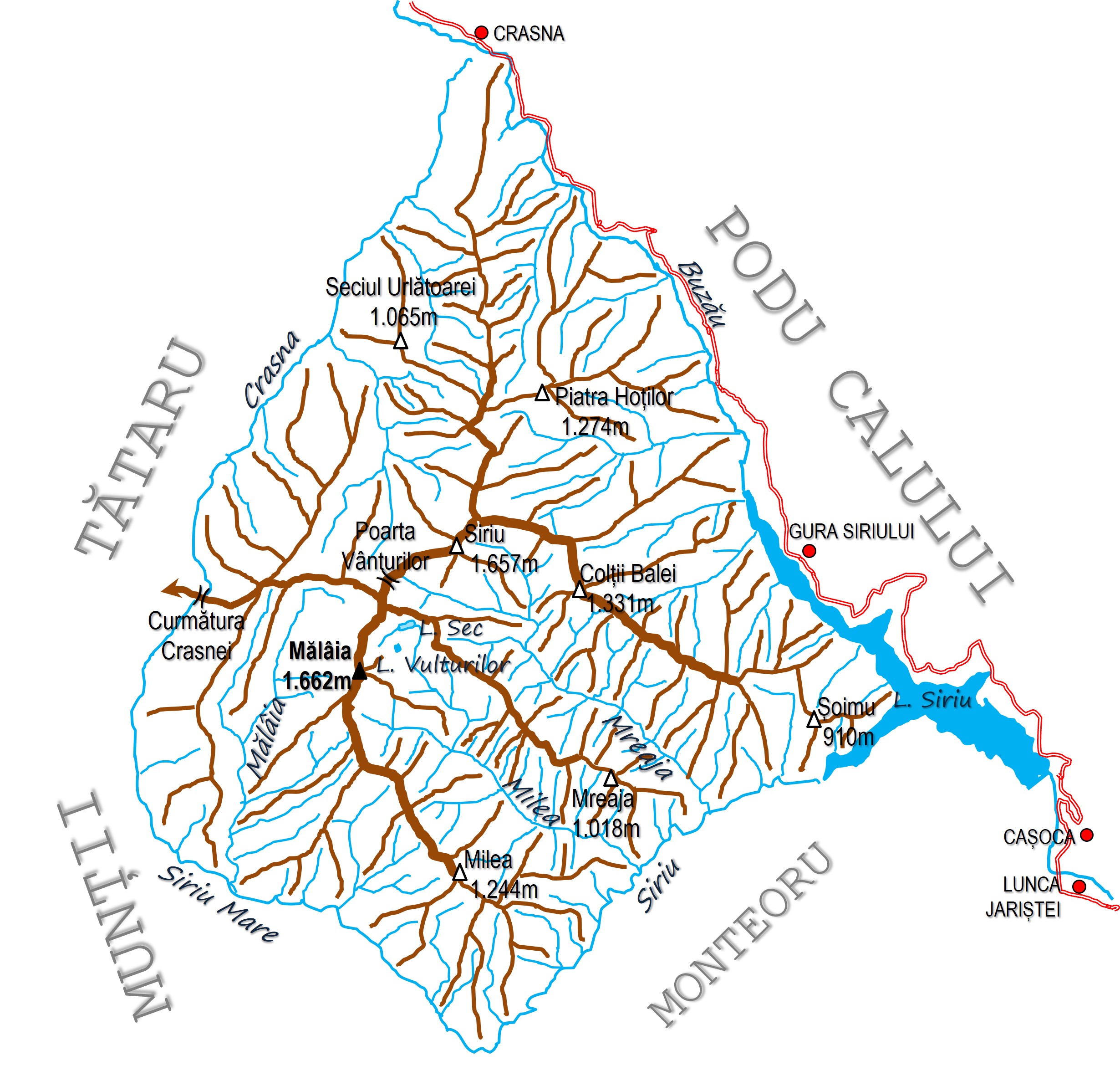 Sintagma Masivul Siriu, mult mai mult ca ale masive muntoase, are sens și în înțelesul restrâns al termenului “masiv” căci munții care îl alcătuiesc formează o … masă unitară și compactă: culmea sa înaltă, alpină – un arc de cerc aproape cât un semicerc – se evidențiază în peisaj asemenea zidurilor unei cetăți; spre nord, “cetatea” este sprijinită de un lung contrafort, Crasna, iar spre sud, unde lipsește îngrăditura, pornește un alt picior de sprijin al fortificației, Mreaja ! Asemenea unei porți de intrare în incinta cetății se arată Poarta Vânturilor, pe aici realizându-se și accesul dinspre Muntele vecin, Tătarul. Granițele cu munții împrejmuitori îl realizează văile Buzăului, Siriului și Crasnei.