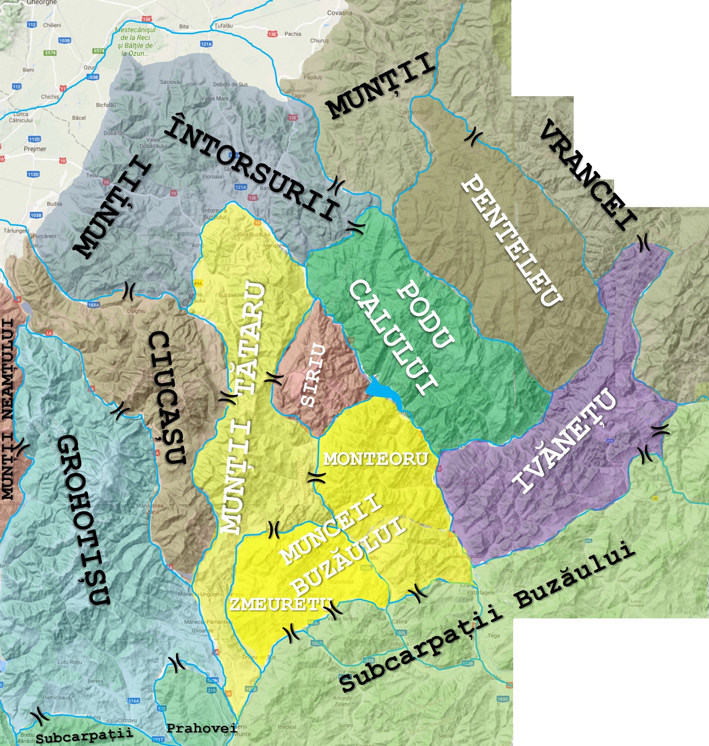 Sintagma “Munții Buzăului” – subdiviziune majoră a Carpaților de Curbură (aici, regionarea lor) – are, în geografie și, implicit, în turism, o accepțiune mult mai … convențională – prin caracterul ei … heteroclit – decât, ceea ce în general exprimă sintagmele uzuale asociate marii majorități a celorlalte masive muntoase din Carpații României. Mai precis, geografii (de exemplu, Alexandru Roșu – în Geografia fizică a României, Edit. Didactică și pedagogică, București, 1980 – sau Gr. Posea și M. Ielenicz – în Munții Buzăului. Ghid turistic, Editura Sport-Turism, București, 1977) înglobează în Munții Buzăului Penteleul, Ivănețul, Podul Calului, Siriul, Tătarul, Monteorul și Zmeuretul; accepțiune la care am achiesat și noi !