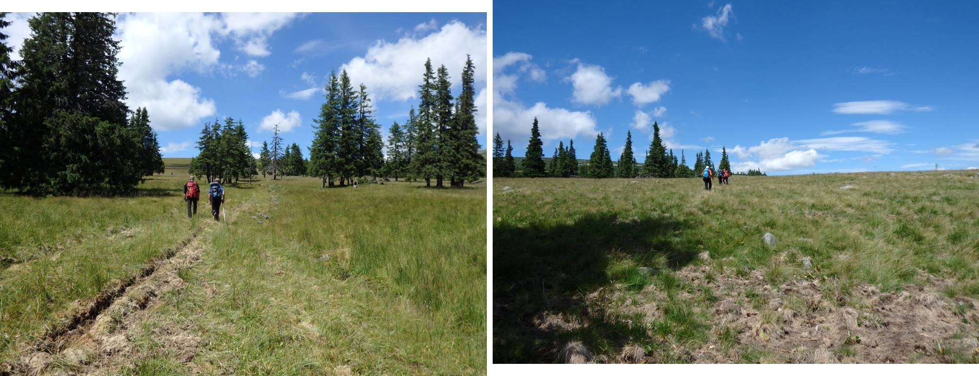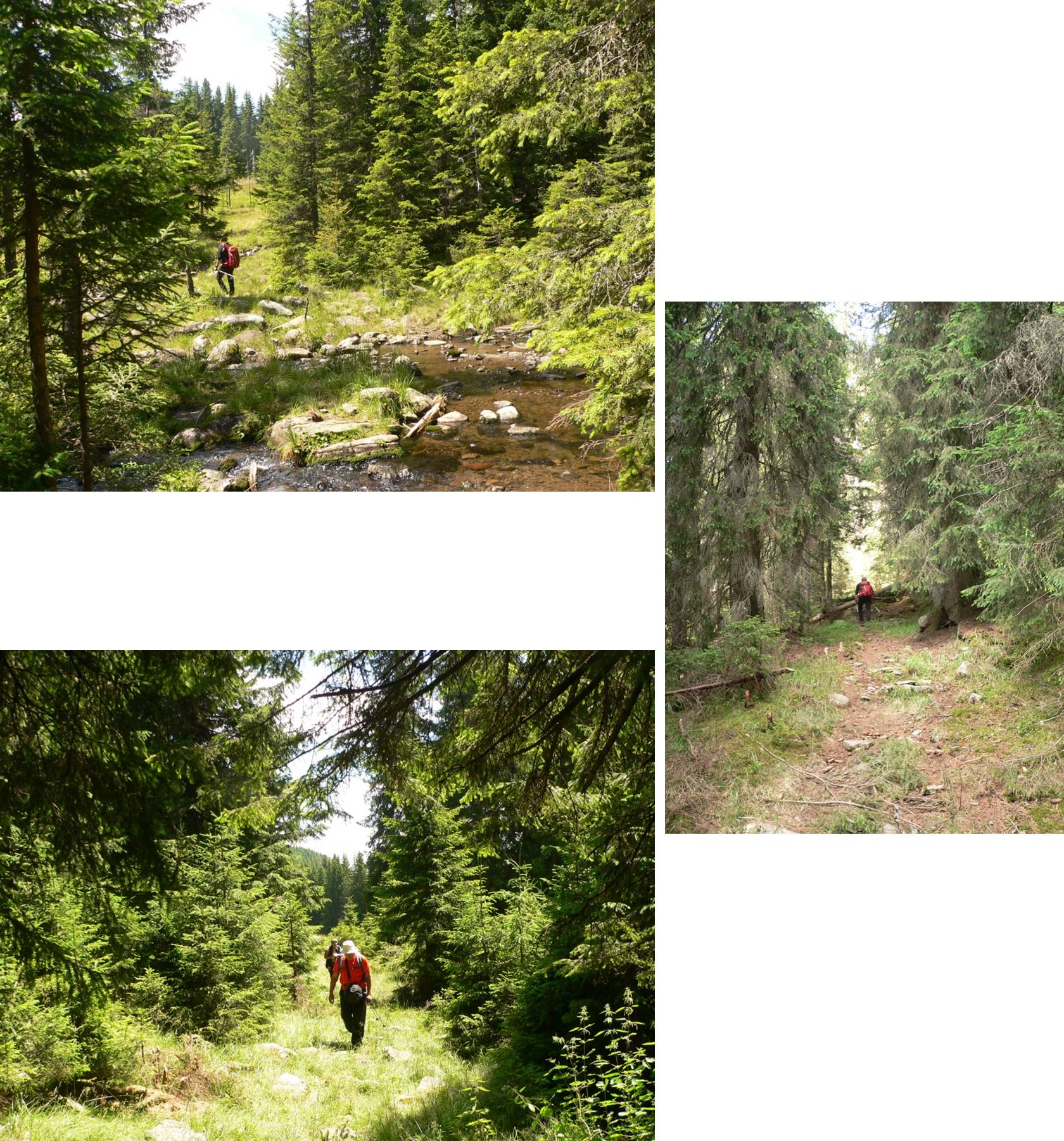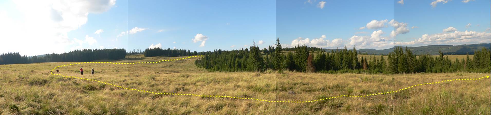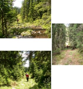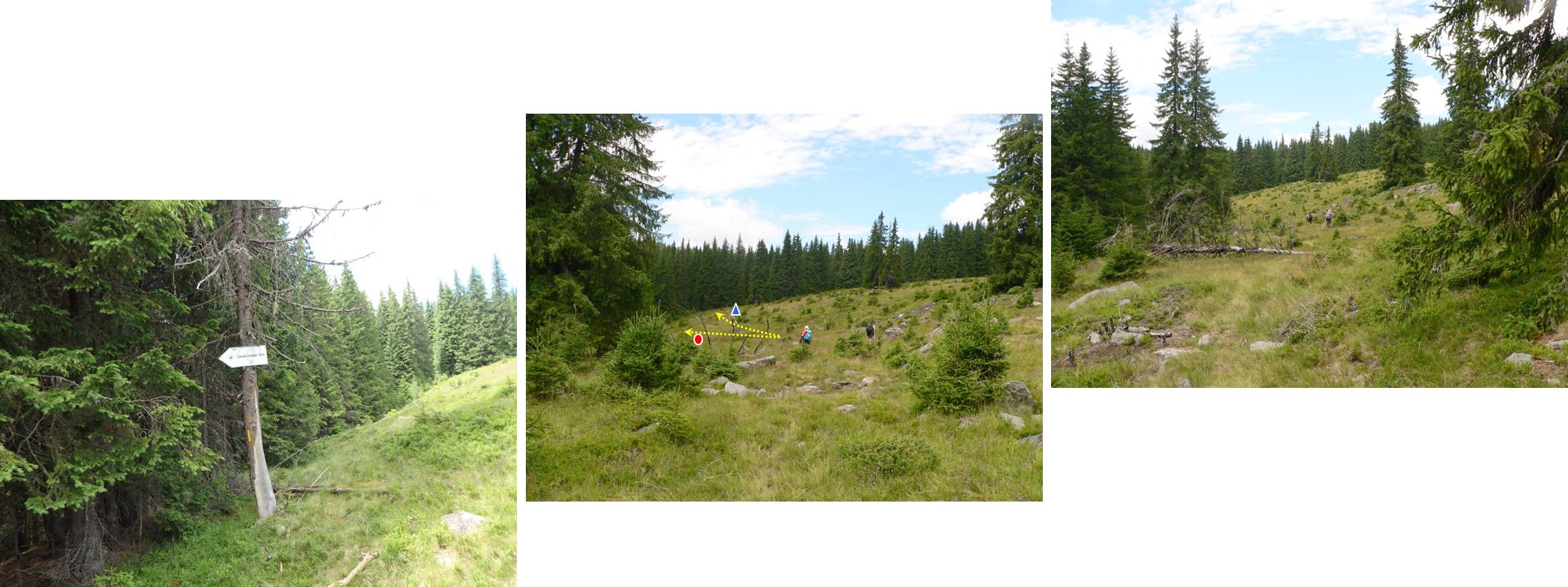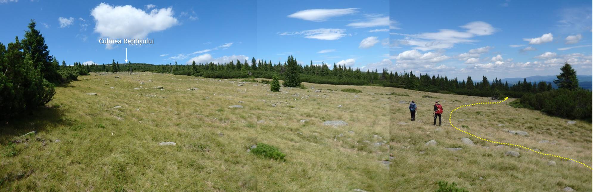 De aici părăsim marcajul – ce suie spre Vf. Rețițiș -, schimbând direcția cu 90 de grade spre dreapta, de cum întâlnim un drum de tractor, transversal pe direcția noastră (anterioară). Conform unora dintre hărțile Călimanilor ar trebui să fie marcat cu cruce galbenă; pe teren, nici vorbă (doar, pe doi bolovani, am observat urme ale unor … puncte roșii – ?) !
