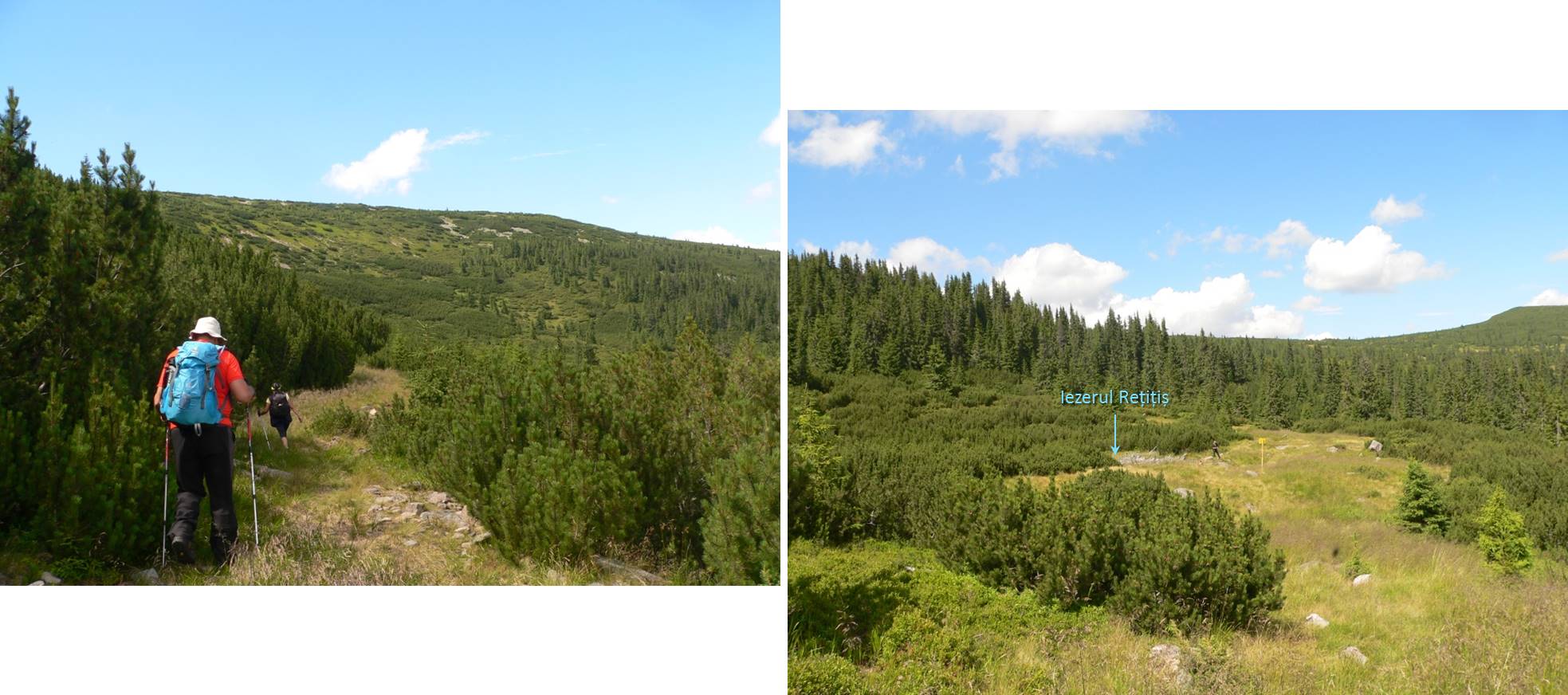 … intrând într-un golf ce înaintează în … marea de jnepeni dincolo de care este Iezerul Rețițiș. Poteca ce duce la el își are cestălalt capăt în sud-estul golfului; …