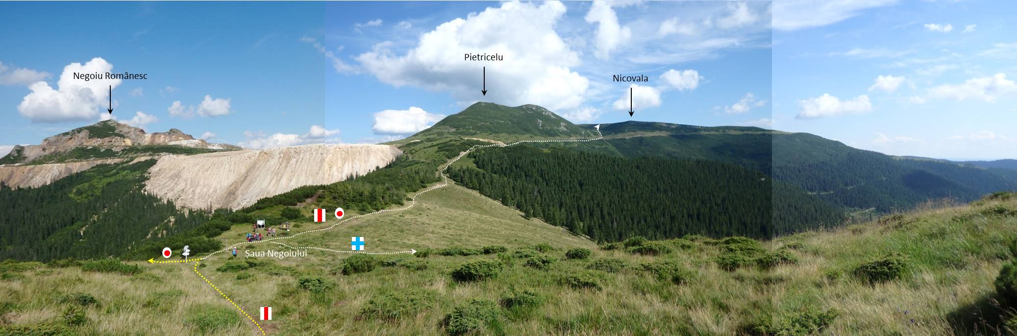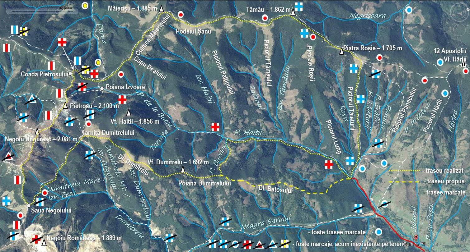 Traseu: Gura Panacului/Tăieturii – Piciorul Tăieturii – Poiana Stânei Pietrele Roșii – Culmea Pietrele Roșii – Fața Tamăului (Vf. Tamău) – Podeiul Șanu – Culmea Măierișului – Coada Pietrosului – Vf. Pietrosu – Vf. Negoiu Unguresc – Șaua Negoiului – Drumul Mariei Tereza – Tarnița Dumitrelului – Dl. Dumitrelu – Vf. Dumitrelu – Poiana Dumitrelului – Valea Bucilor – Valea Haitii – Gura Panacului