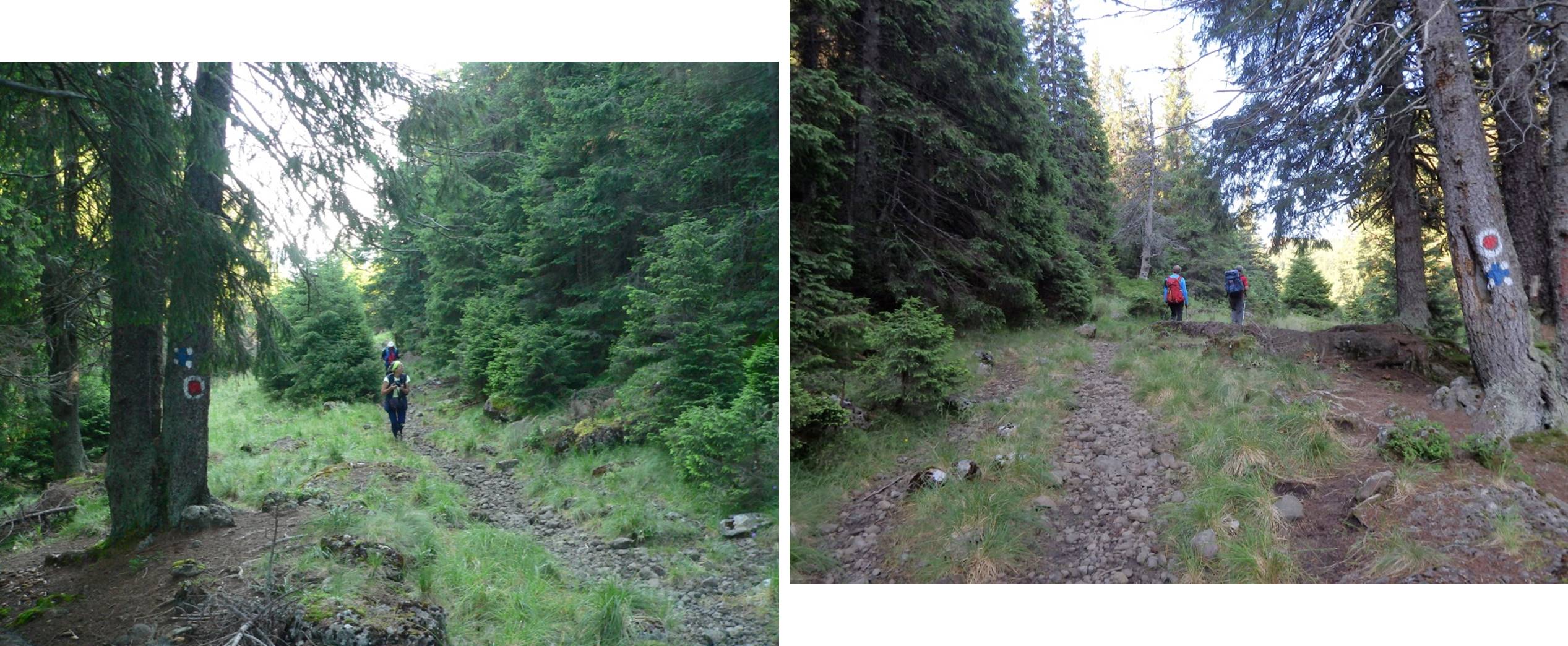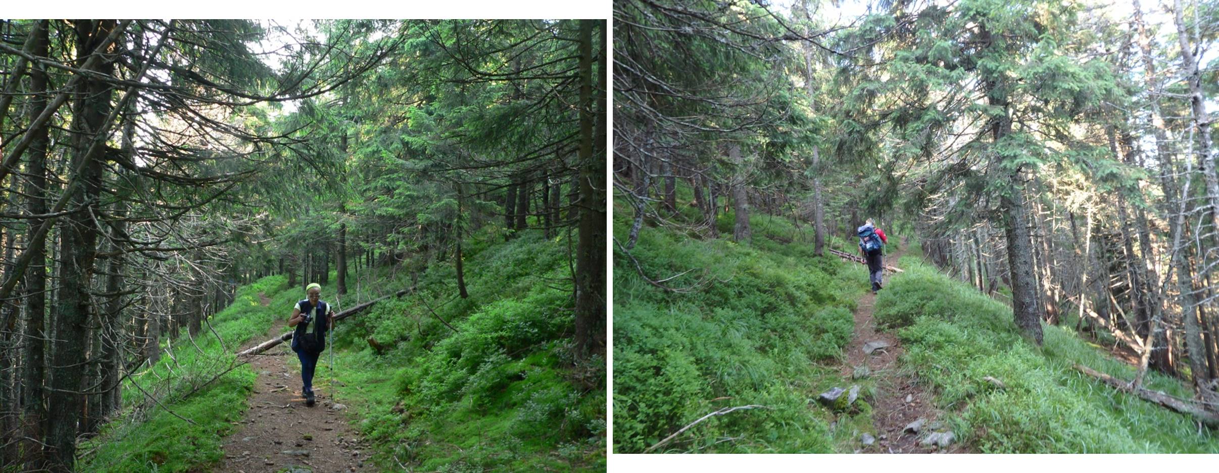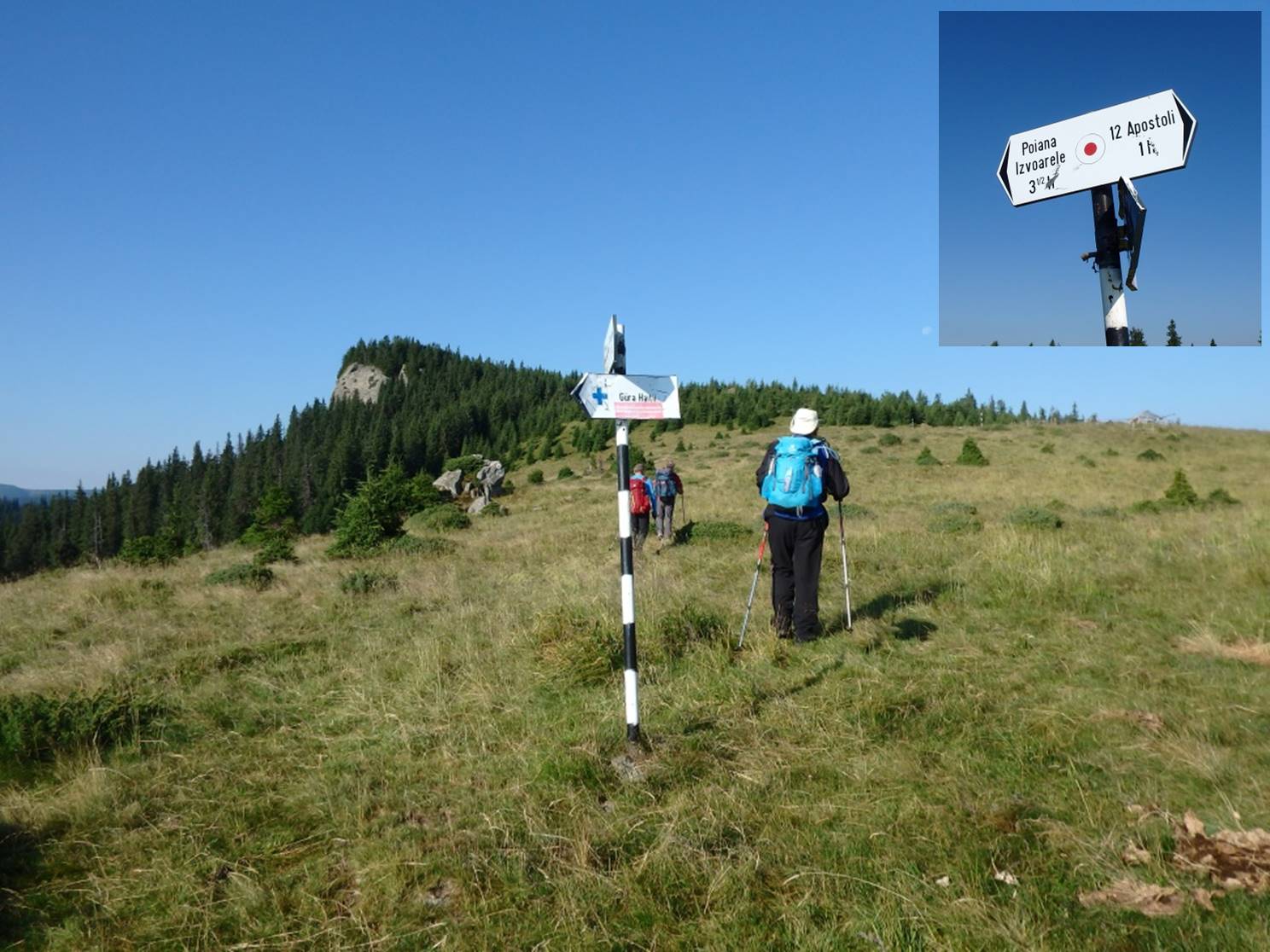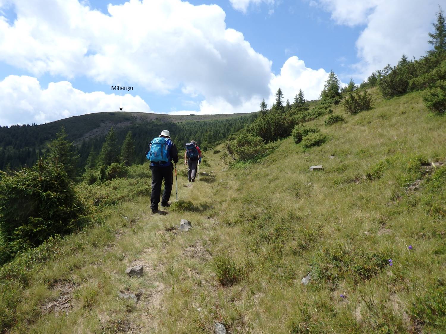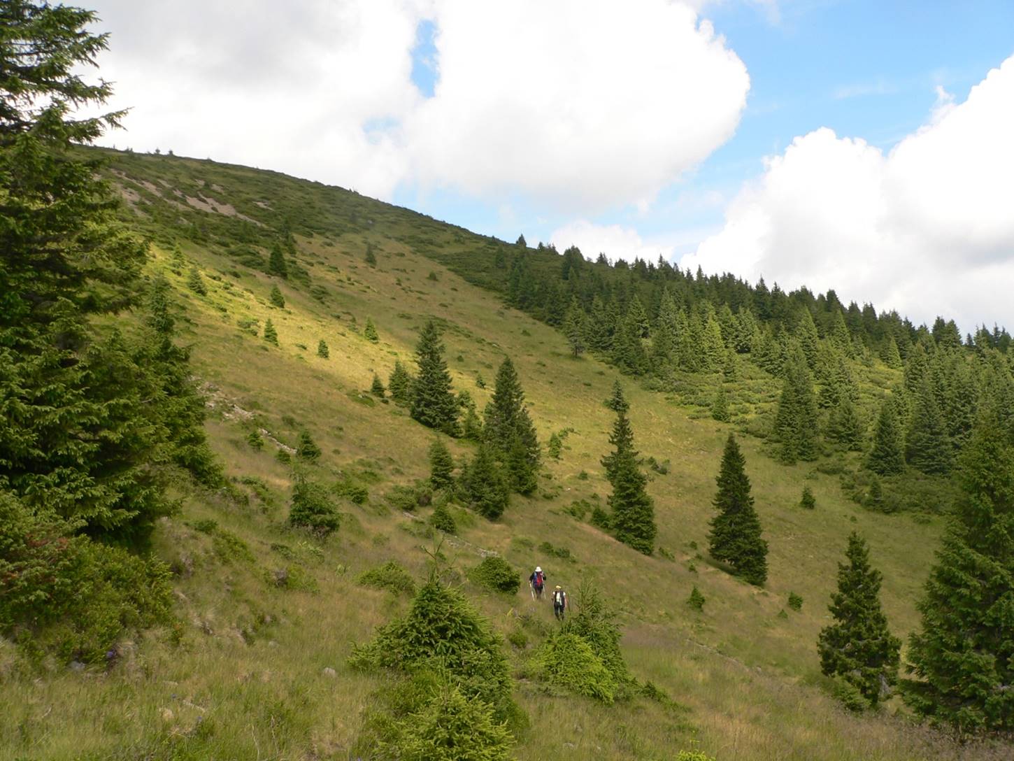Urcușul spre Vf. Pietrosu începe cu o scurtă plimbare pe <Drumul Mariei Tereza>. Ni s-a atașat o familie de prin Botoșani ajunsă la Popasul Iosif al II-lea pe traseul Gura Haitii – Poiana Izvoare (cruce roșie).