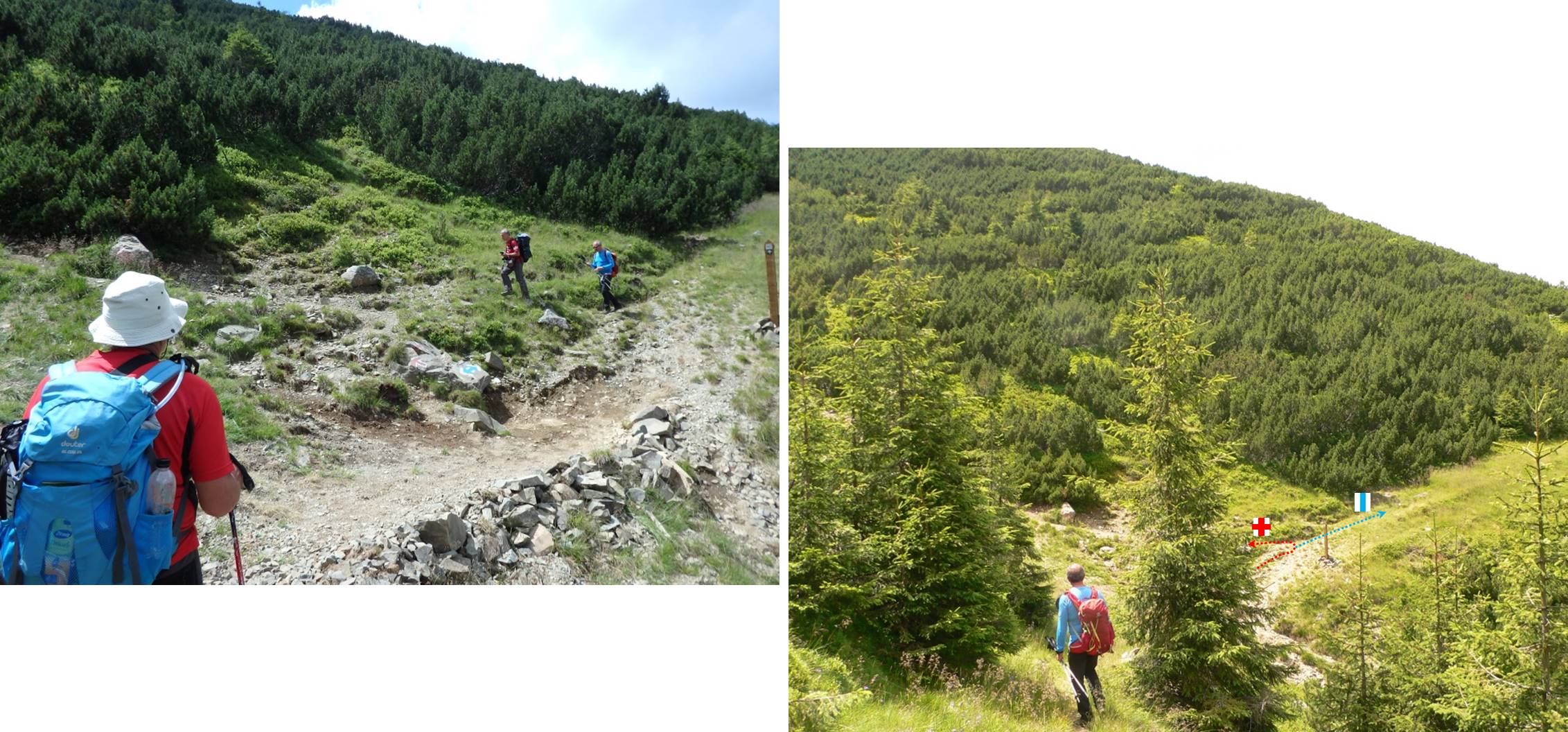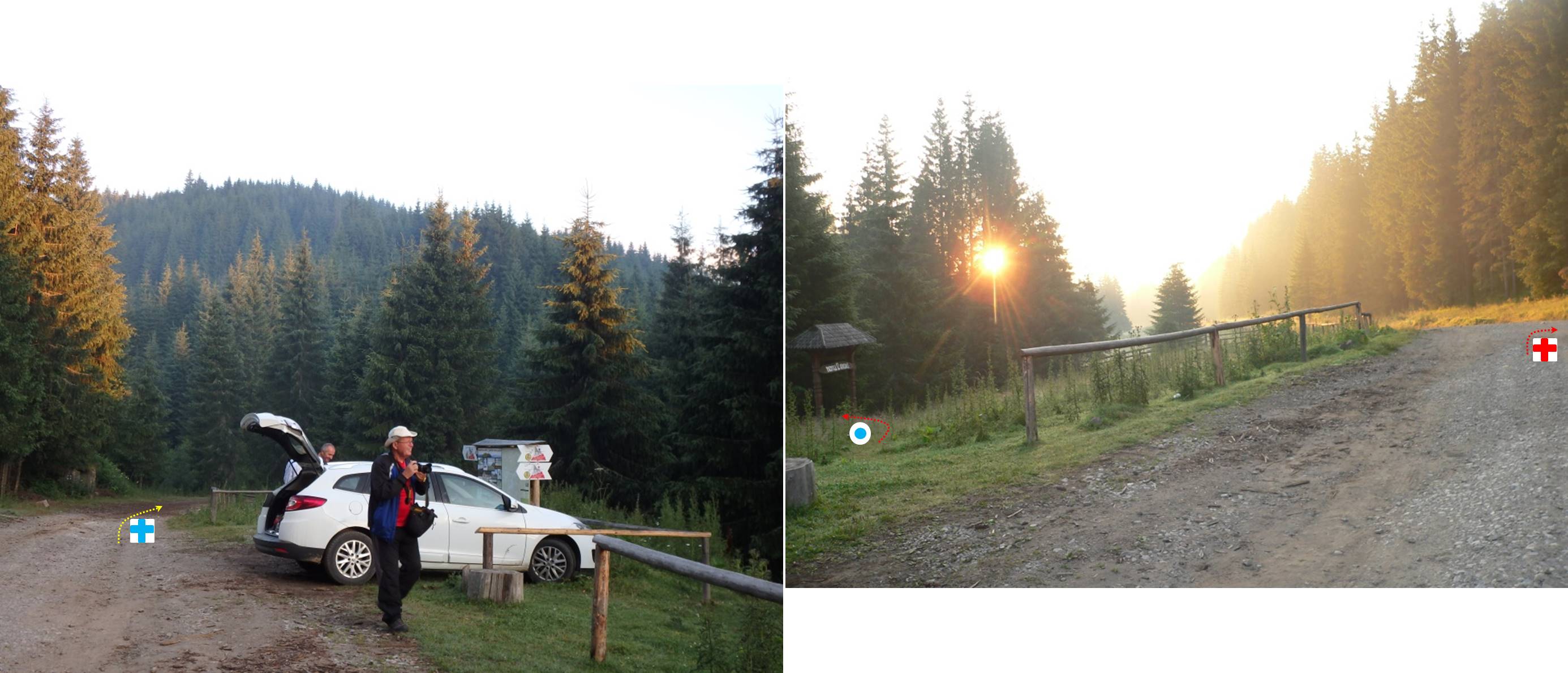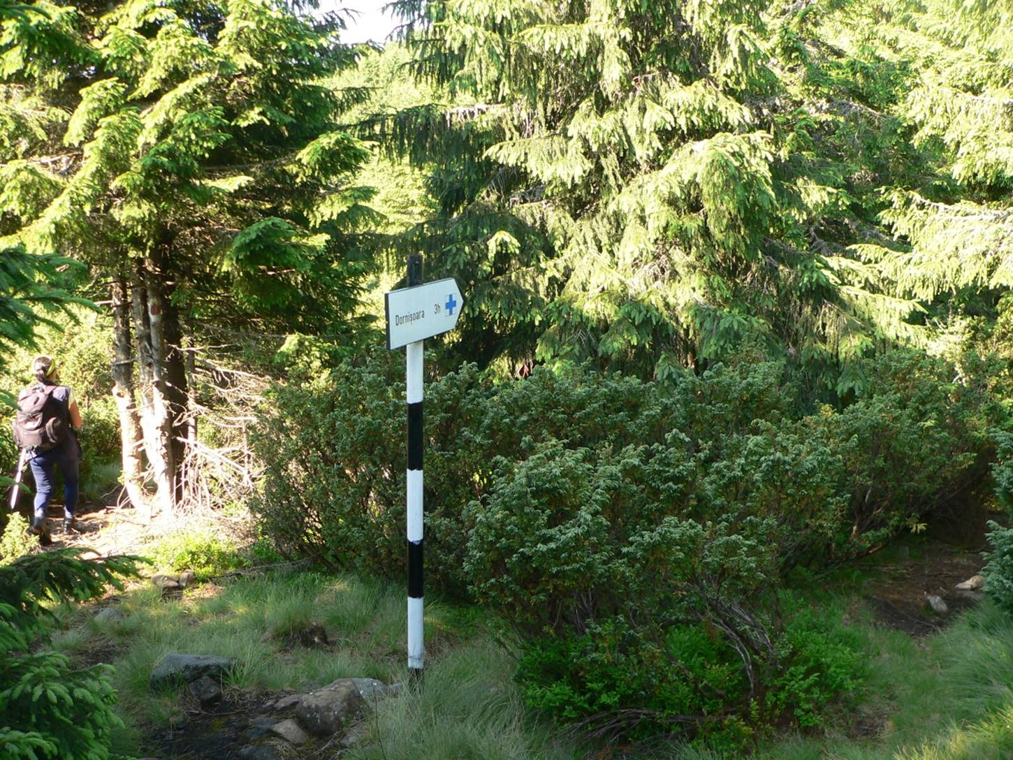 … întâlnim marcajul punct roșu care ne va conduce până sub Pietrosu (poiana Izvoare/Izvoarelor fiind în șaua de sub … Coada Pietrosului, deasupra … izvoarelor Tarniței) !