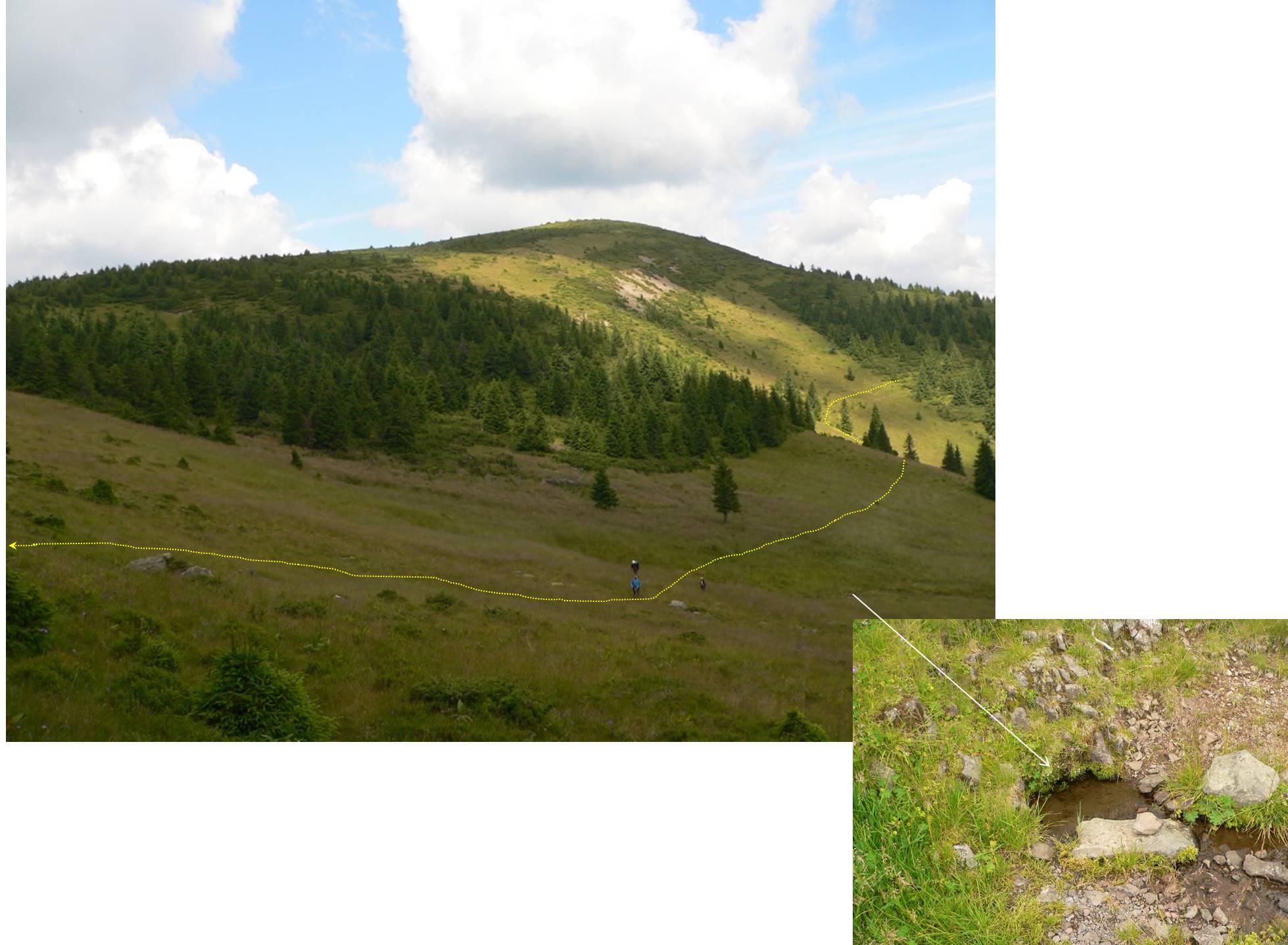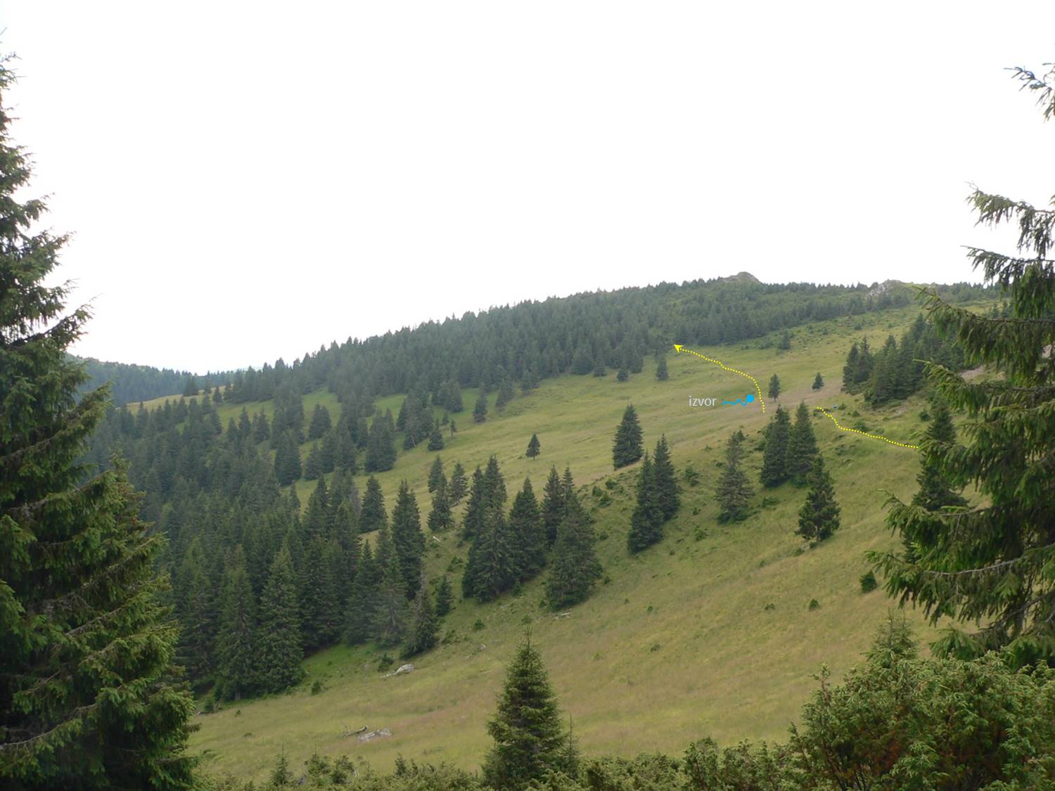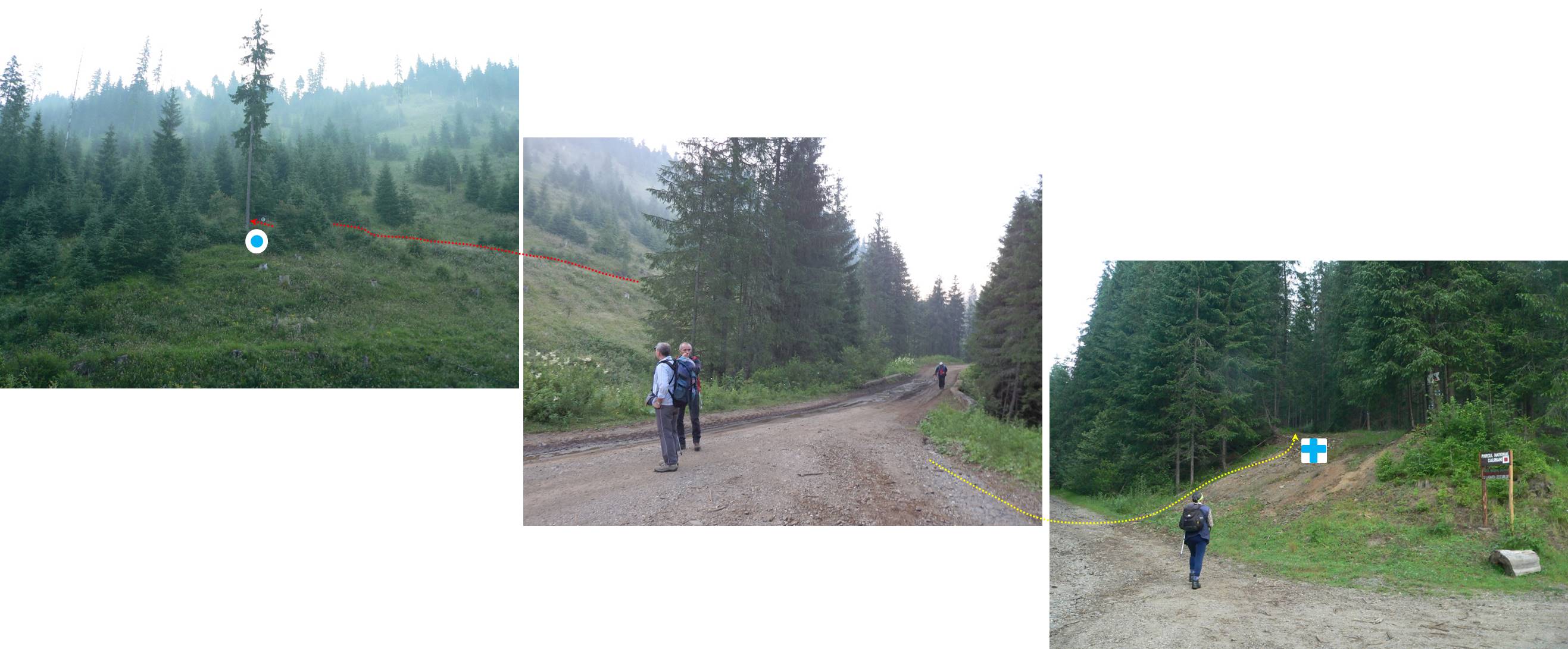 … întâlnim marcajul punct roșu care ne va conduce până sub Pietrosu (poiana Izvoare/Izvoarelor fiind în șaua de sub … Coada Pietrosului, deasupra … izvoarelor Tarniței) !