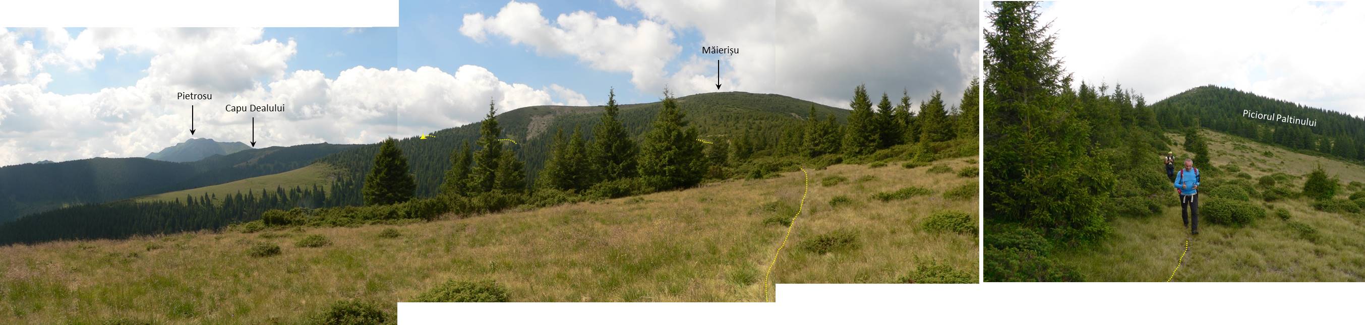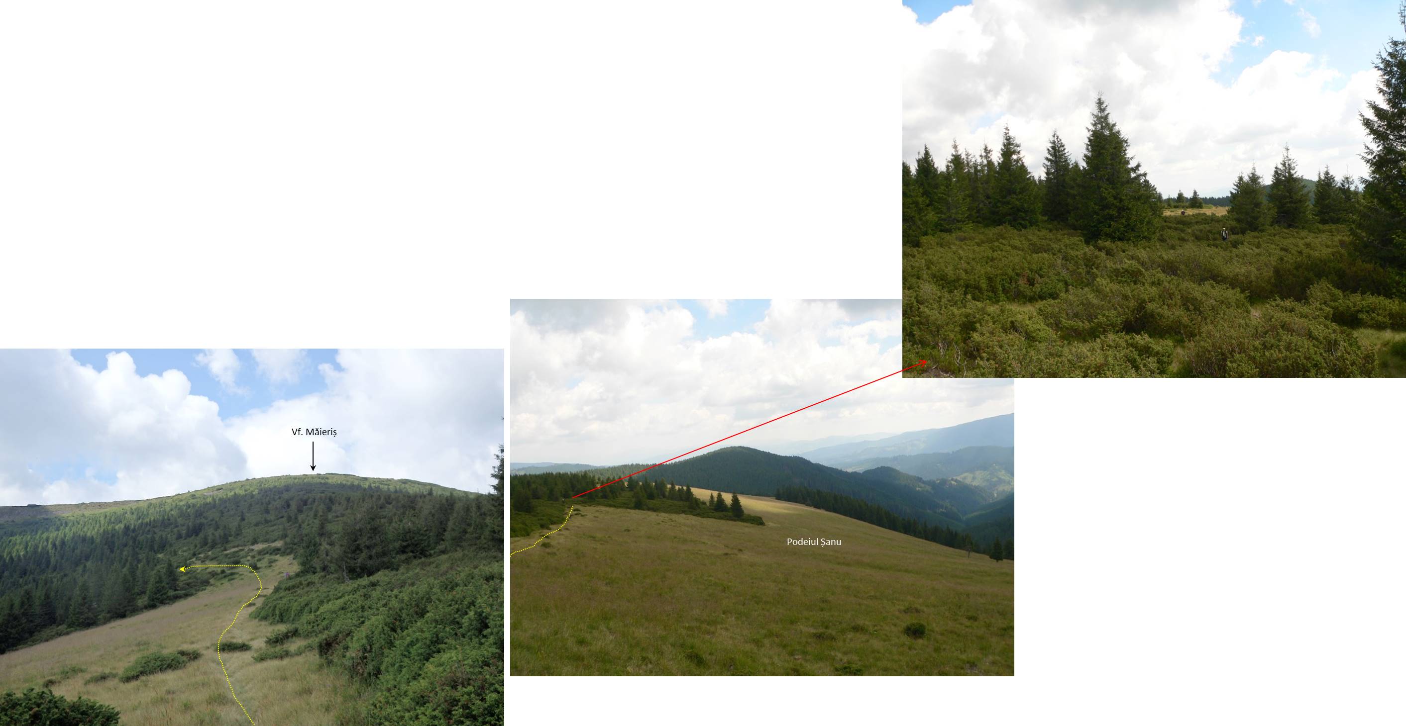 … vom trece pe versantul estic al Muntelui Măierișu, căruia îi evităm vârful pe o potecă ce-i taie coastele pe o curbă de nivel aflată cu mai bine de 100 de metri sub el !