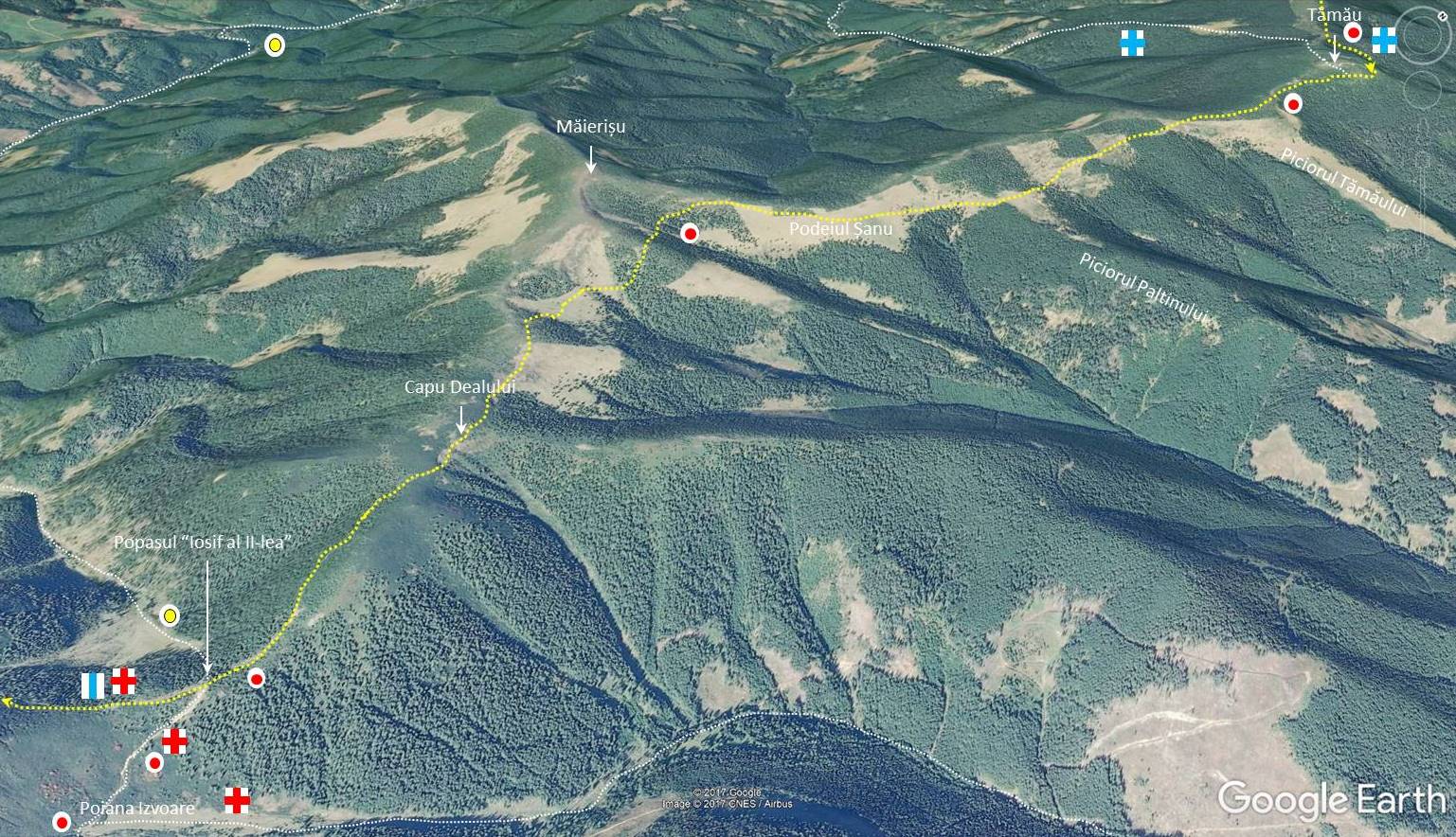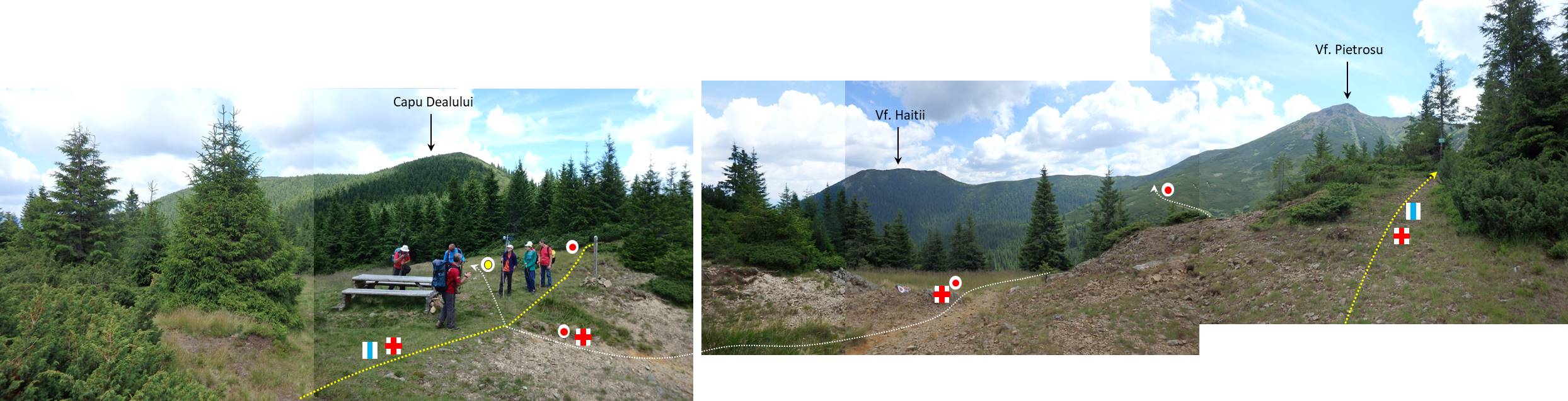 … care, surpriză, suie pe un alt picior (al Tăieturii) decât cel pe care o face pe vechile hărți turistice (al Panacului); și tot o noutate: punctul albastru, care, am văzut deja, nu mai pornește de la gura Haitii, face acum un ocol larg înainte de a se instala pe Piciorul Hârlei (pentru a evita noile amenajări … antropice de pe botul Hârlei) !