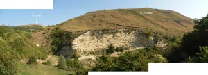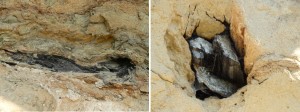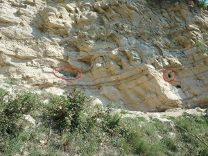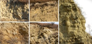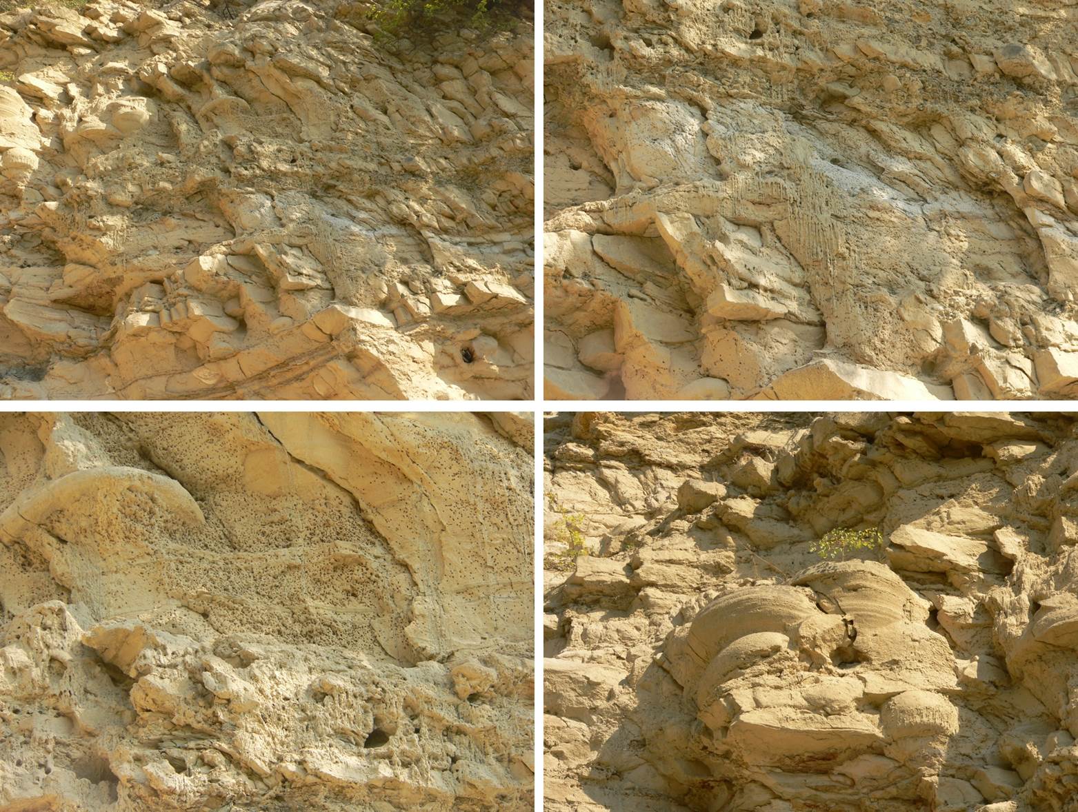 Sunt, astfel, scoase la zi, strate ale miocenului superior (din depuneri de acum 5-10 milioane) formate, în special, din gresii – unele slab calcaroase, argile, nisipuri, cu intercalații de marne și tufuri. Sunt de remarcat și câțiva mici trovanți, prinși între strate de gresie. Dar o … colecție de trovanți în toată regula poate fi admirată deasupra falezelor; i-am consacrat însă un articol special (click aici) !