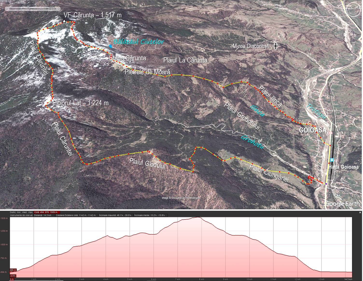 Traseu: (28 februarie 2010): Gura Grohotului – Plaiul Ciungăriei – Plaiul Glodului – Vf. Glodului – Mt. Piciorul Lat – Plaiul Căruntei – Vf. Cărunta – Stâna Cărunta – La Pietrele de Moară – Plaiul Ilinca – Gura Ilincăi – Gura Grohotului