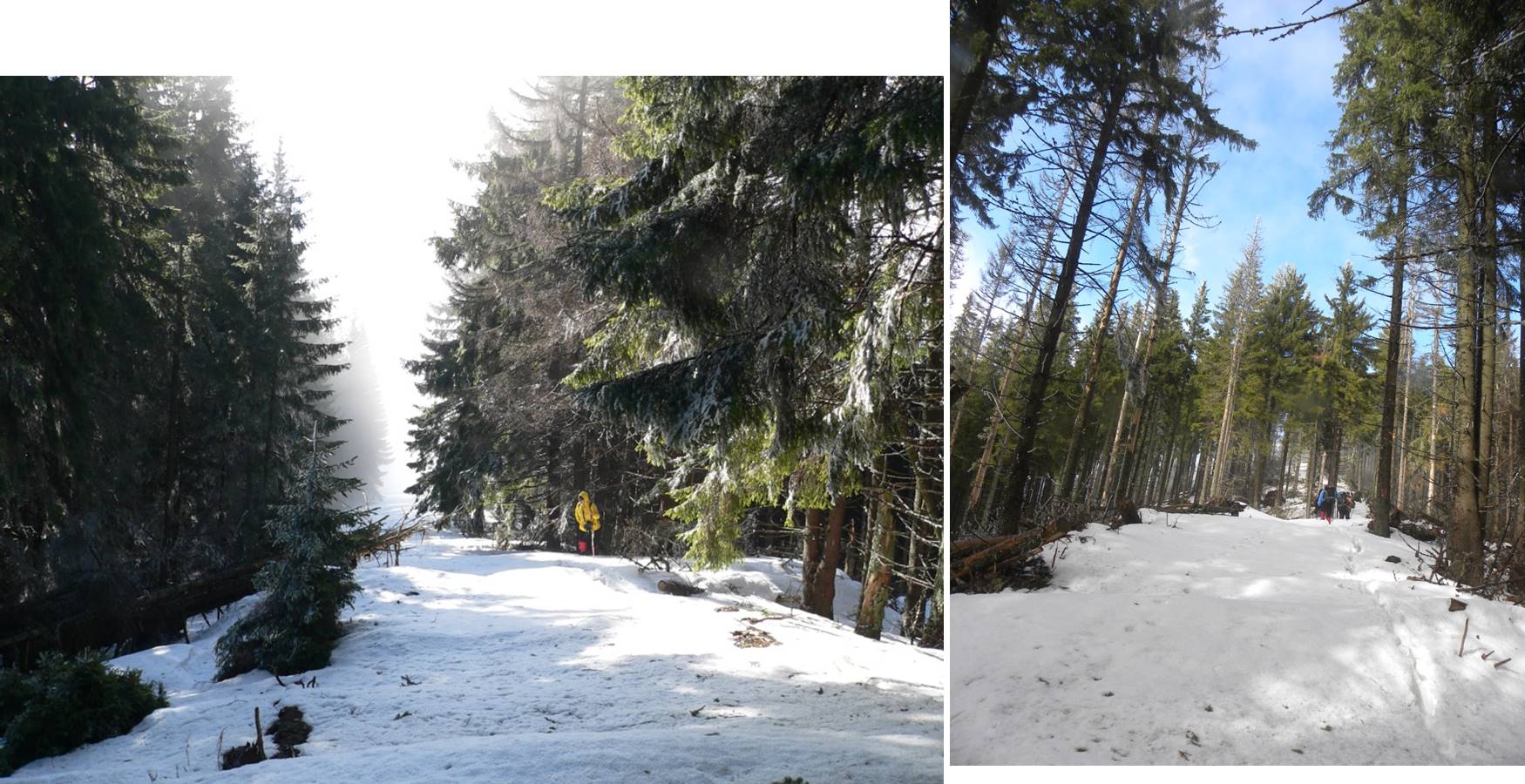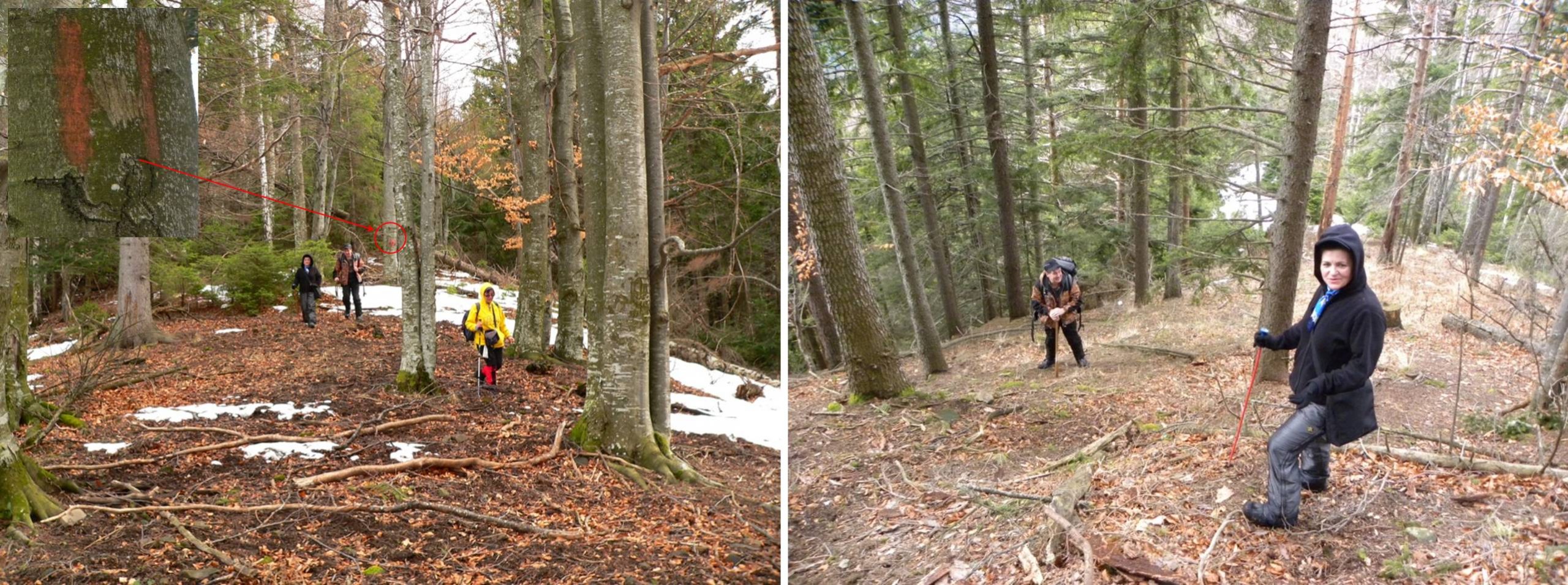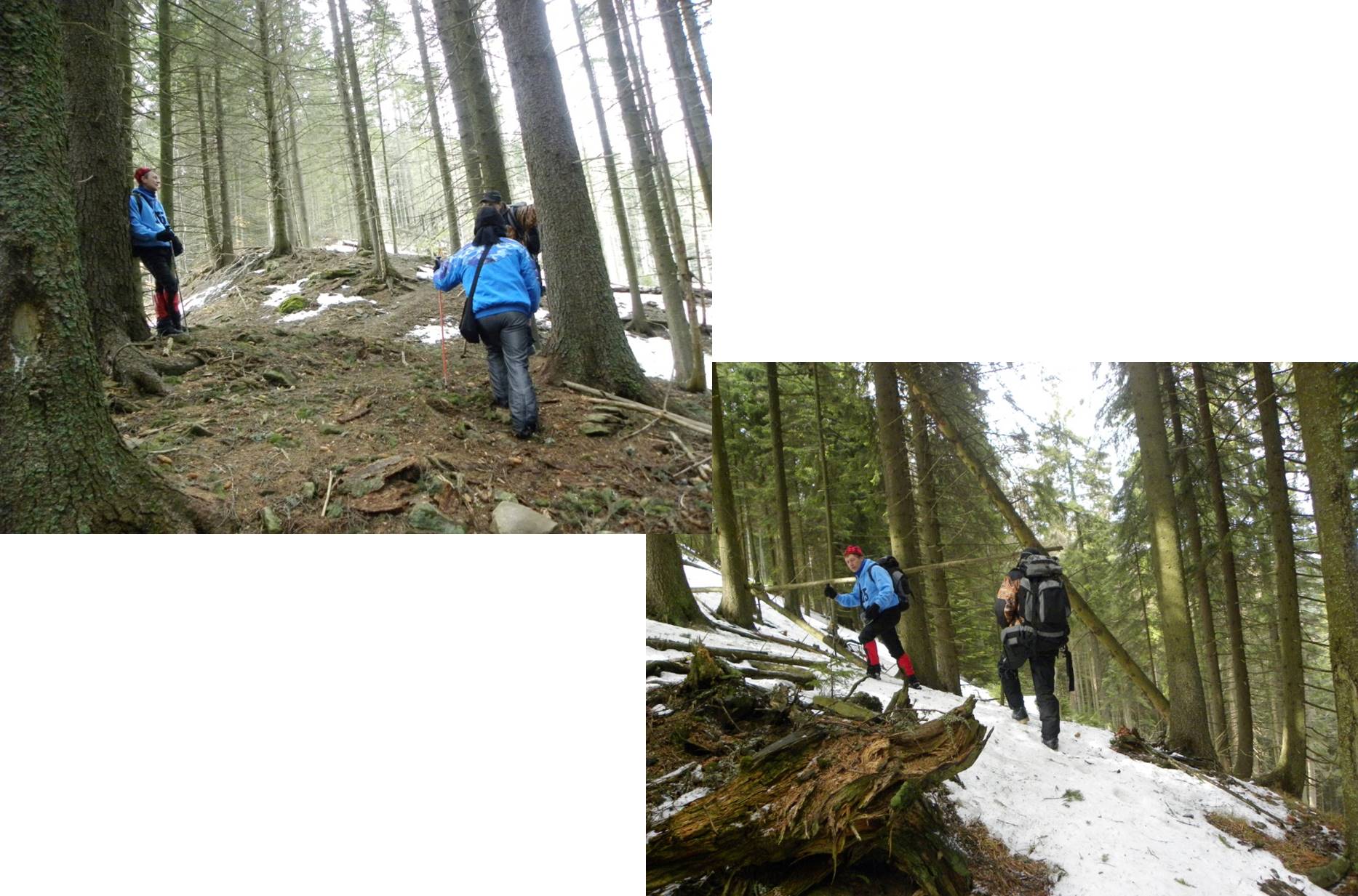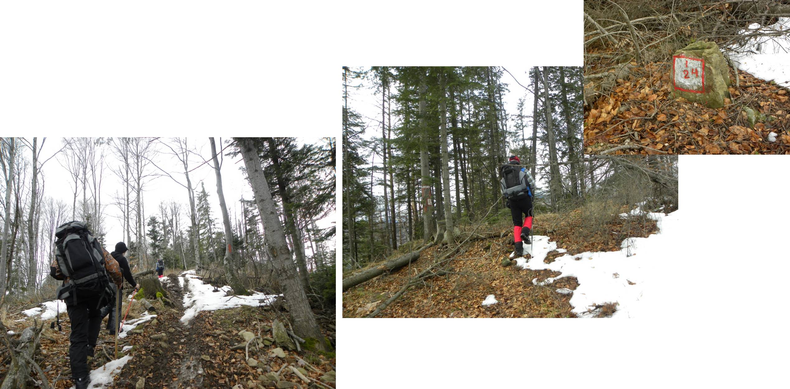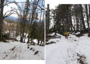 Schimbăm direcția de mers cu 90 de grade spre dreapta și coborâm de pe Vârful Glodului, urmând un marcaj silvic format din două benzi roșii verticale; …