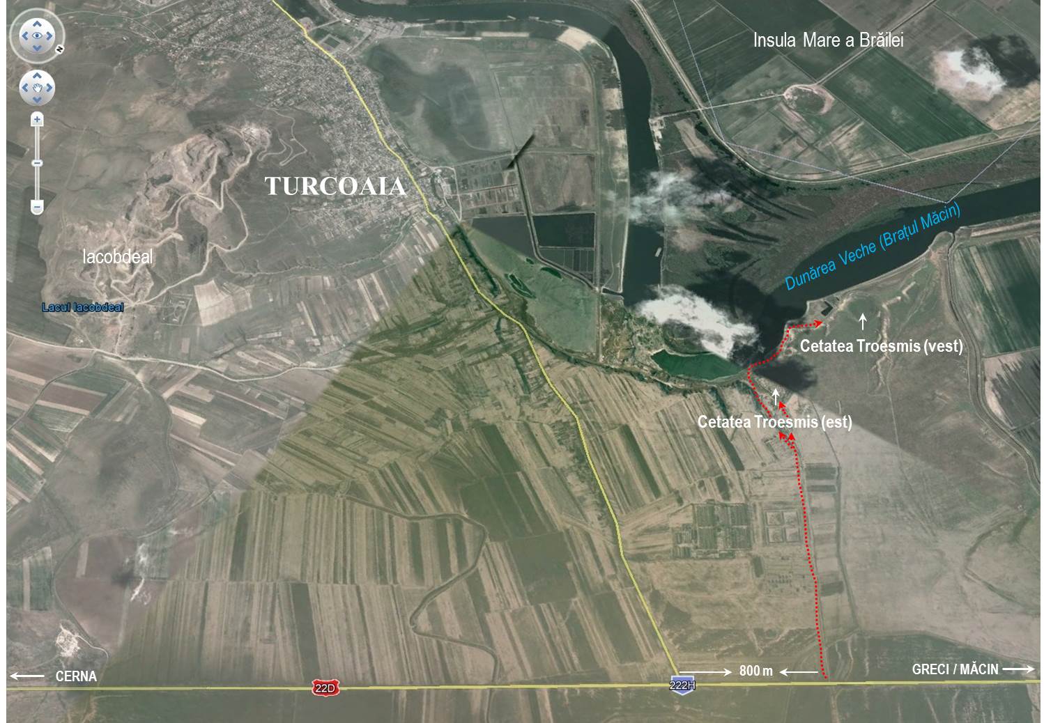 [la intersecția DN 22D, Măcin-Cerna, cu drumul de pământ ce duce, după 1,5 km, la “Cetatea” Troesmis-Est, se află un indicator!]