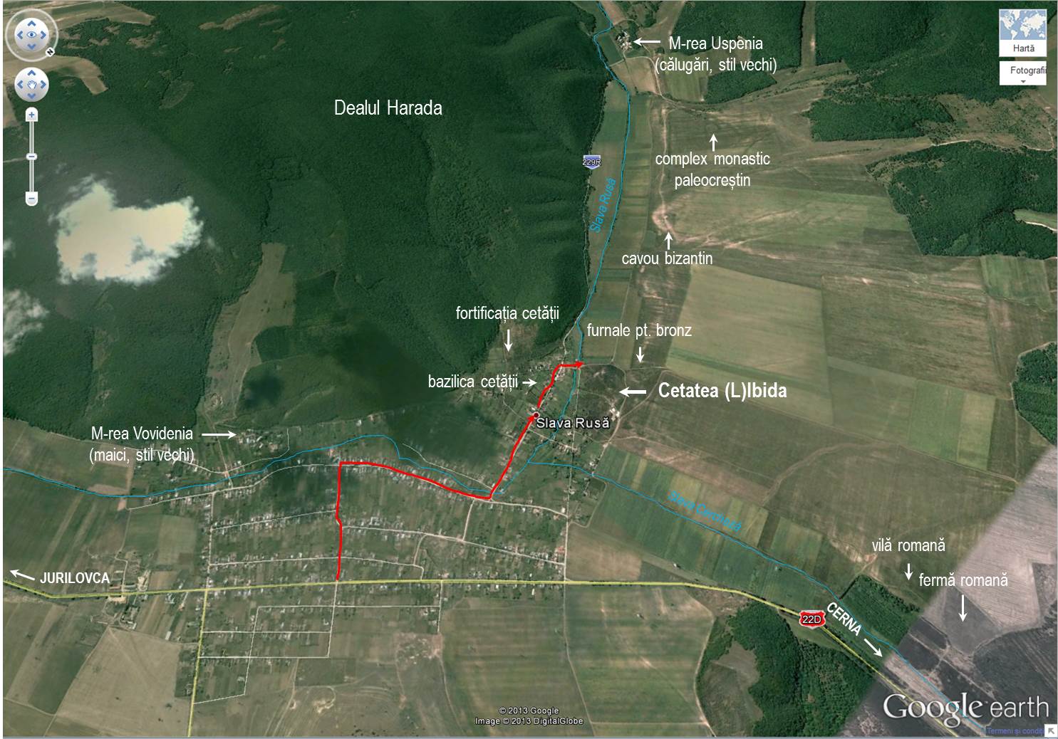 În satul Slava Rusă (comuna Slava Cercheză), pleacă din DN 22D, pe care am venit de la Cerna (și vom merge spre Jurilovca), un drum proaspăt asfaltat, ce duce, după 4 km, la Mânăstirea Uspenia. La intersecția celor două drumuri se află o placă ce indică direcția spre Cetatea (L)Ibida. După ce străbatem satul Slava Rusă (2 km), pe la extremitatea sa sud-vestică, ajungem în zona cetății accesibilă publicului larg (imediat ce, părăsind drumul asfaltat, traversăm, spre dreapta, pârâul Slava Rusă).