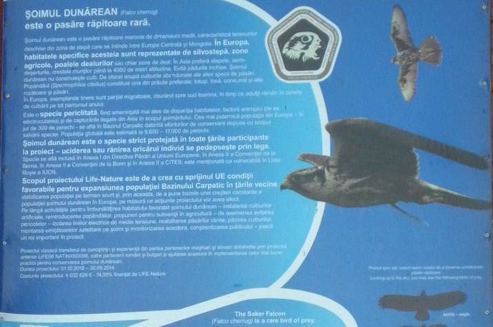 … un panou informativ despre șoimul-dunărean (Falco cherrug), o specie cam dispărută de la noi, cu o mică probabilitate putând fi întâlnit în Munții Măcinului !
