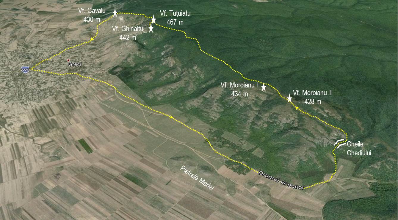 Greci – Drumul Grecilor – Cheile Chediului – Vârful Moroianu II – Vf. Ghinaltu – Vf. Țuțuiatu – Vf. Cavalu – Greci