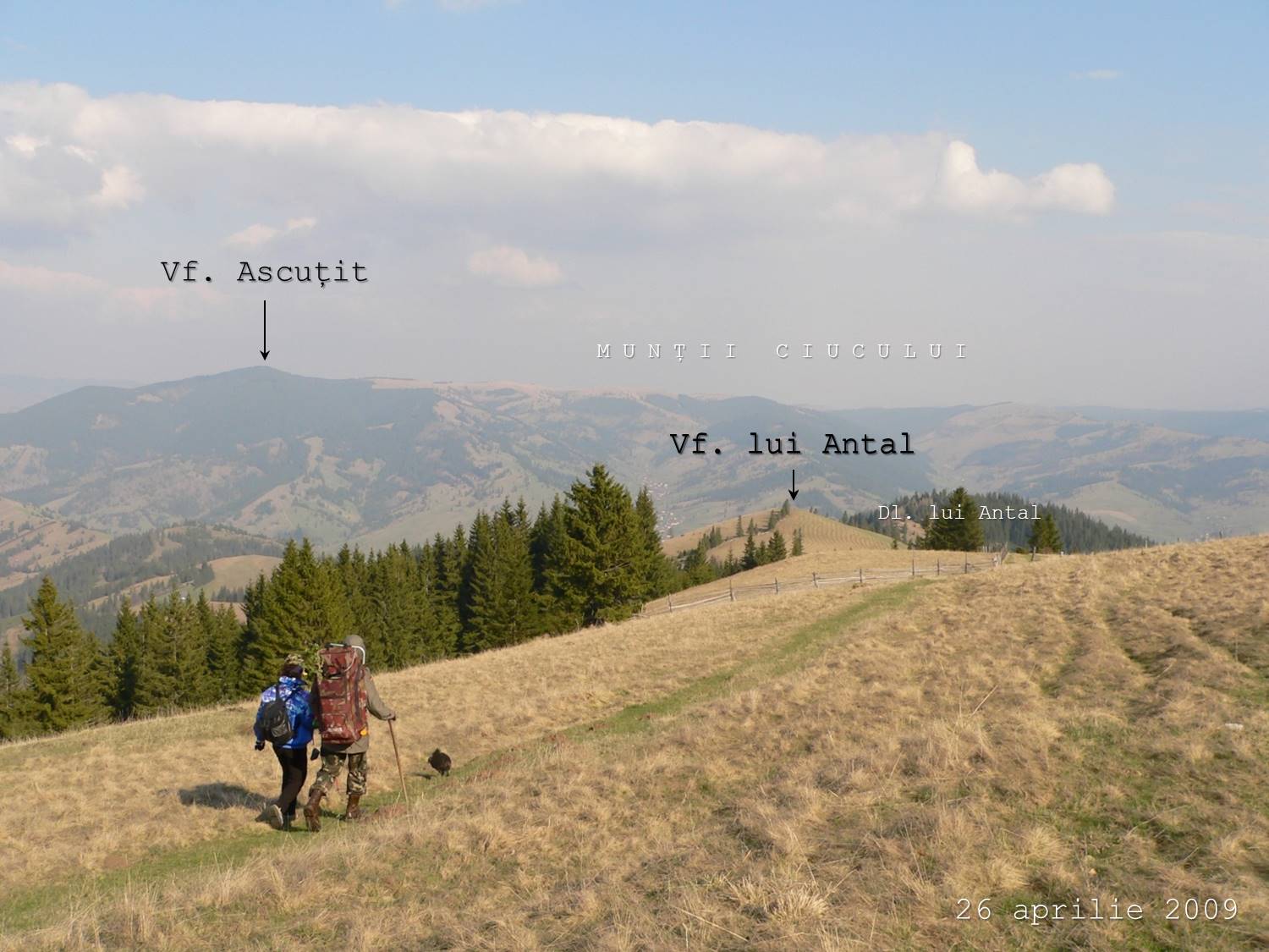 Drumul de culme ne duce până dincolo de Vârful Antal (împreună cu marcajul cruce albastră), …