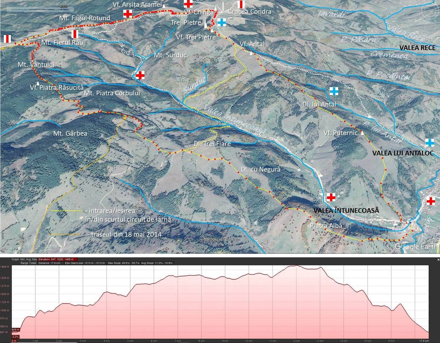 (Scurt-)circuitul de iarnă: VALEA ÎNTUNECOASĂ (gura Surducului) – Valea Surducului – Culmea Mt. lui Antal – Vf. Trei Pietre – Trei Pietre – Vf. Chinga – Mt. Arșița Aramei – Mt. Fagul Rotund – Mt. Fierul Rău – Mt. Vântului – Mt. Piatra Răsucită – Mt. Piatra Corbului – Mt. Gârbea – Dl. Trei Fiare – Valea Întunecoasă