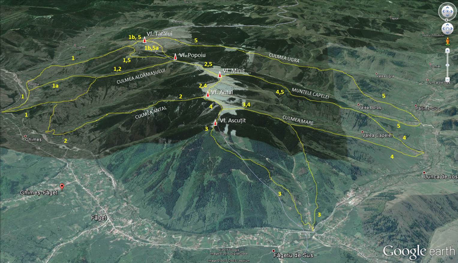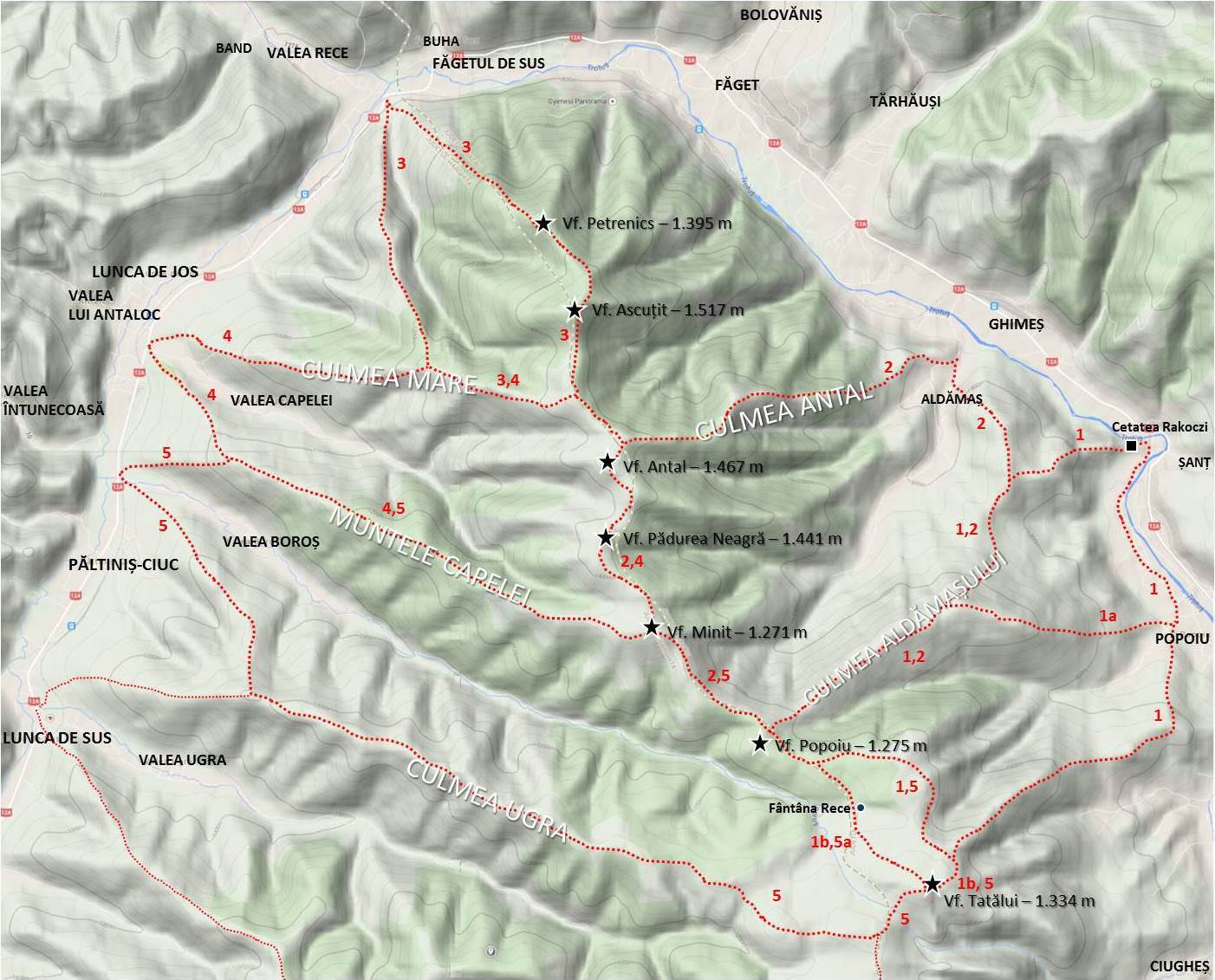 5. Valea Boroș (Lunca de Jos) – Muntele Capelei – Vf. Minit – Vf. Popoiu – Culmea Fântâna Rece – Vf. Tatălui – Culmea Ugra – Valea Boroș