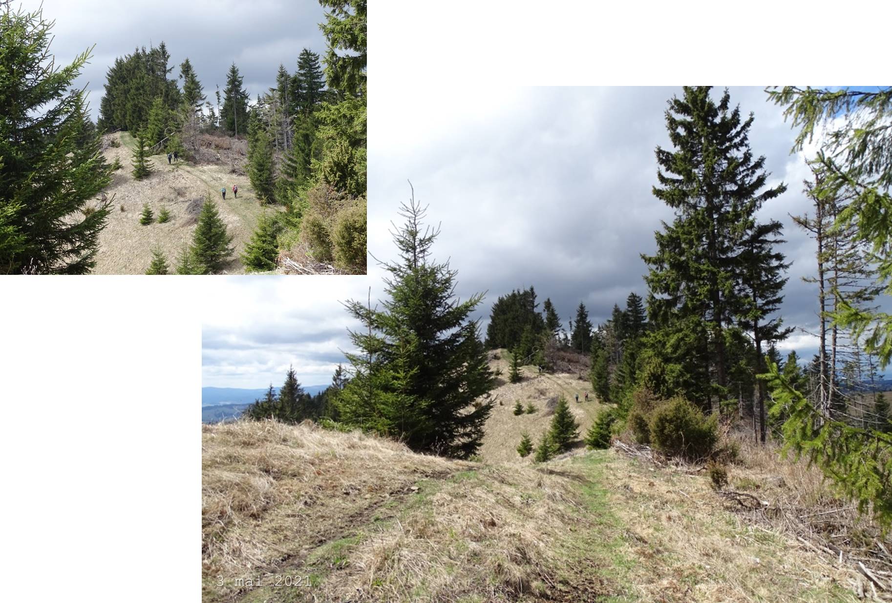 De pe vârf plecăm spre nord-est, dar vom ocoli spre stânga (nord, apoi nord-vest) pâlcul de pădure lângă care ajungem.