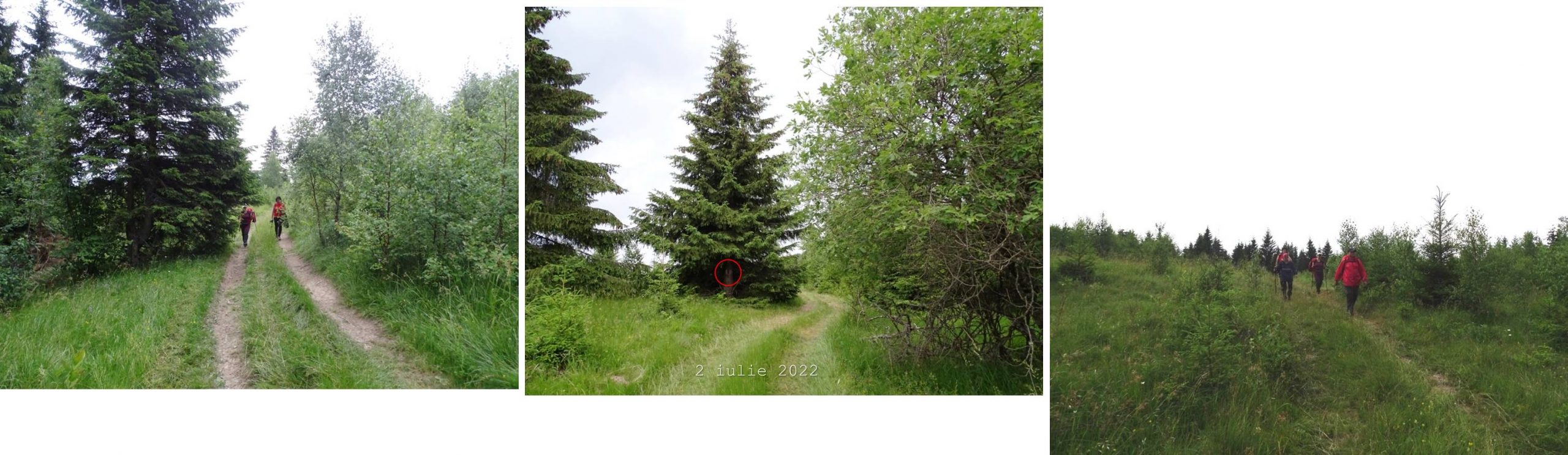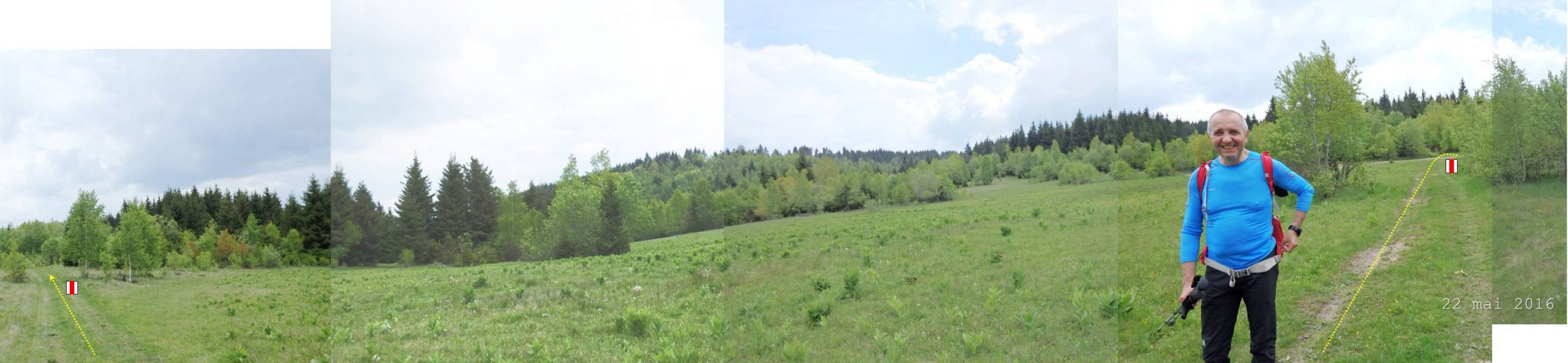 … ajungem într-o poiană, parțial înmlăștinită, punct important al traseului, căci de aici schimbăm direcția cu aproape 90 de grade spre stânga (nord-nord-est) !