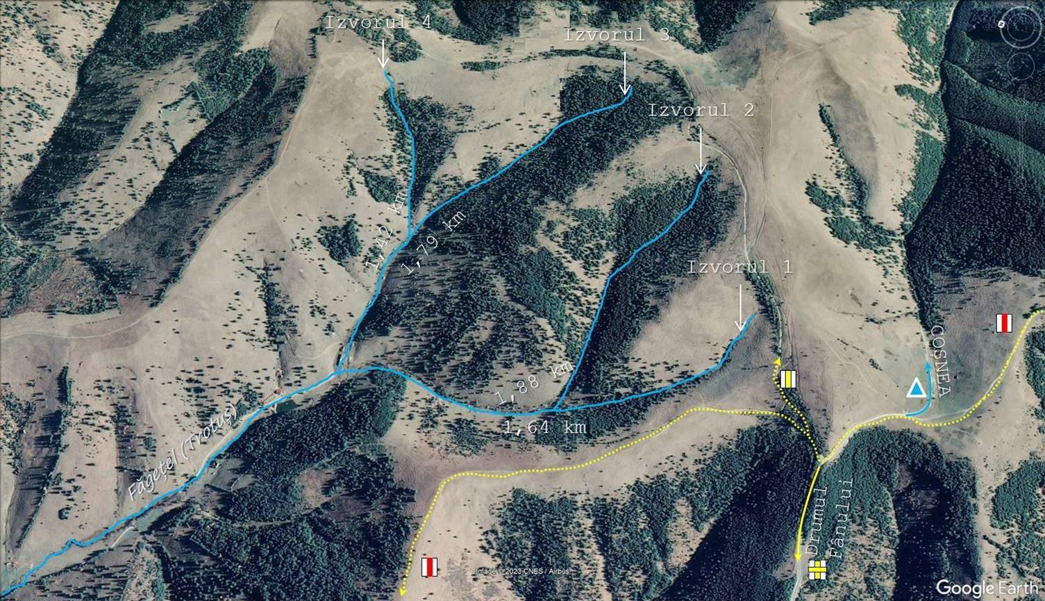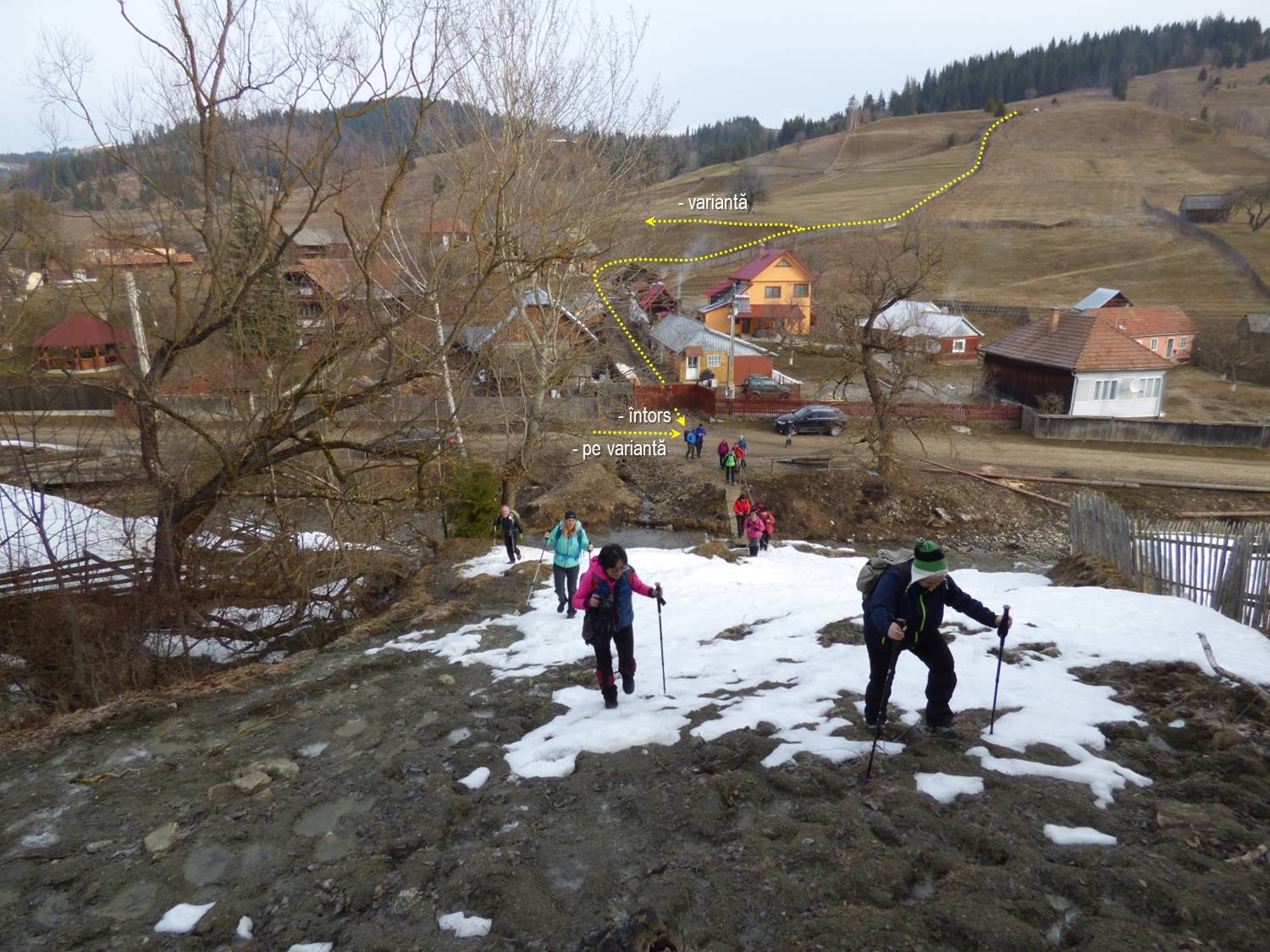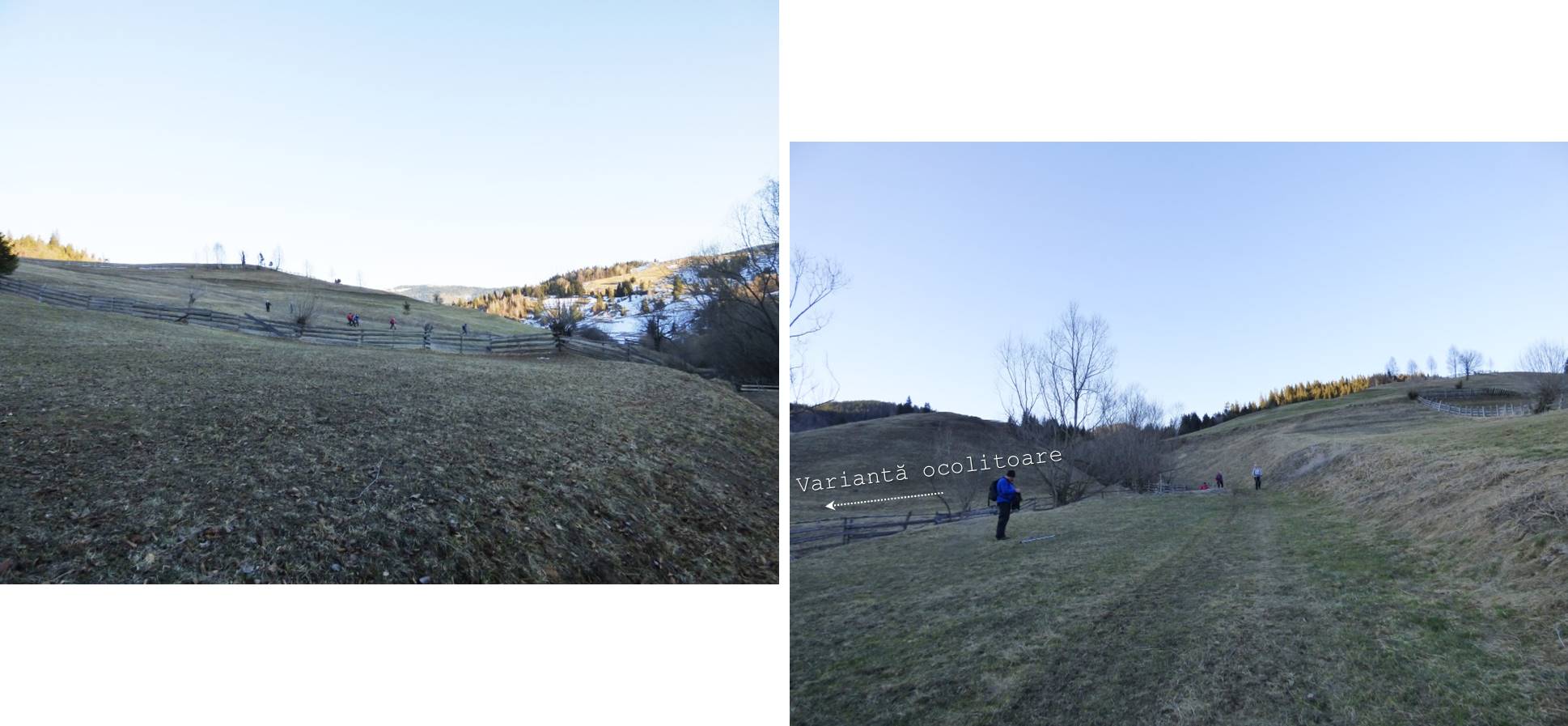 Intrăm în ambele trasee prin același punct – marcat pe schița satelitară -, de unde un podeț ne trece apa dincolo de care ne preia un drumeag zdrumicat de copitele vitelor ce-l folosesc.