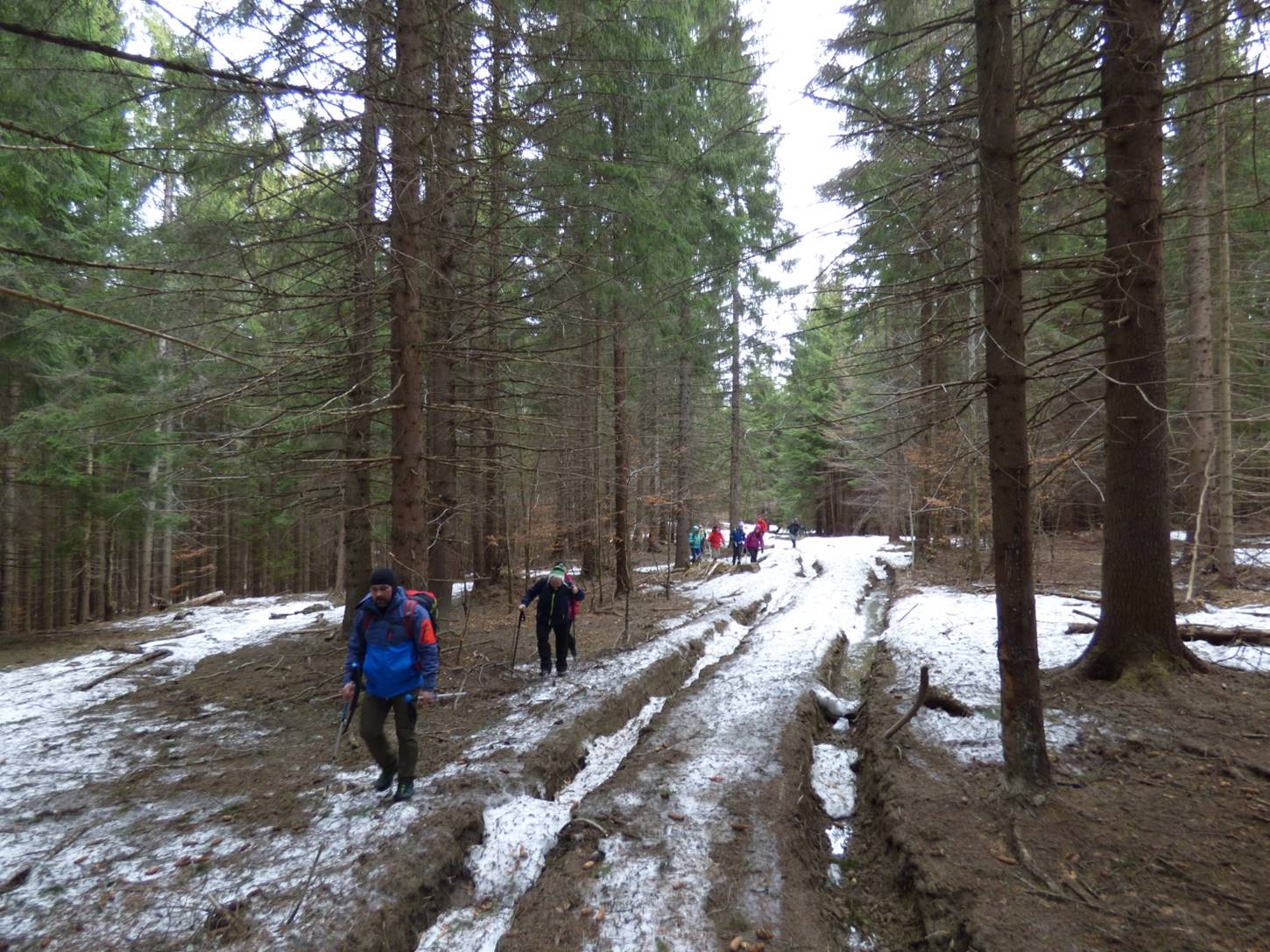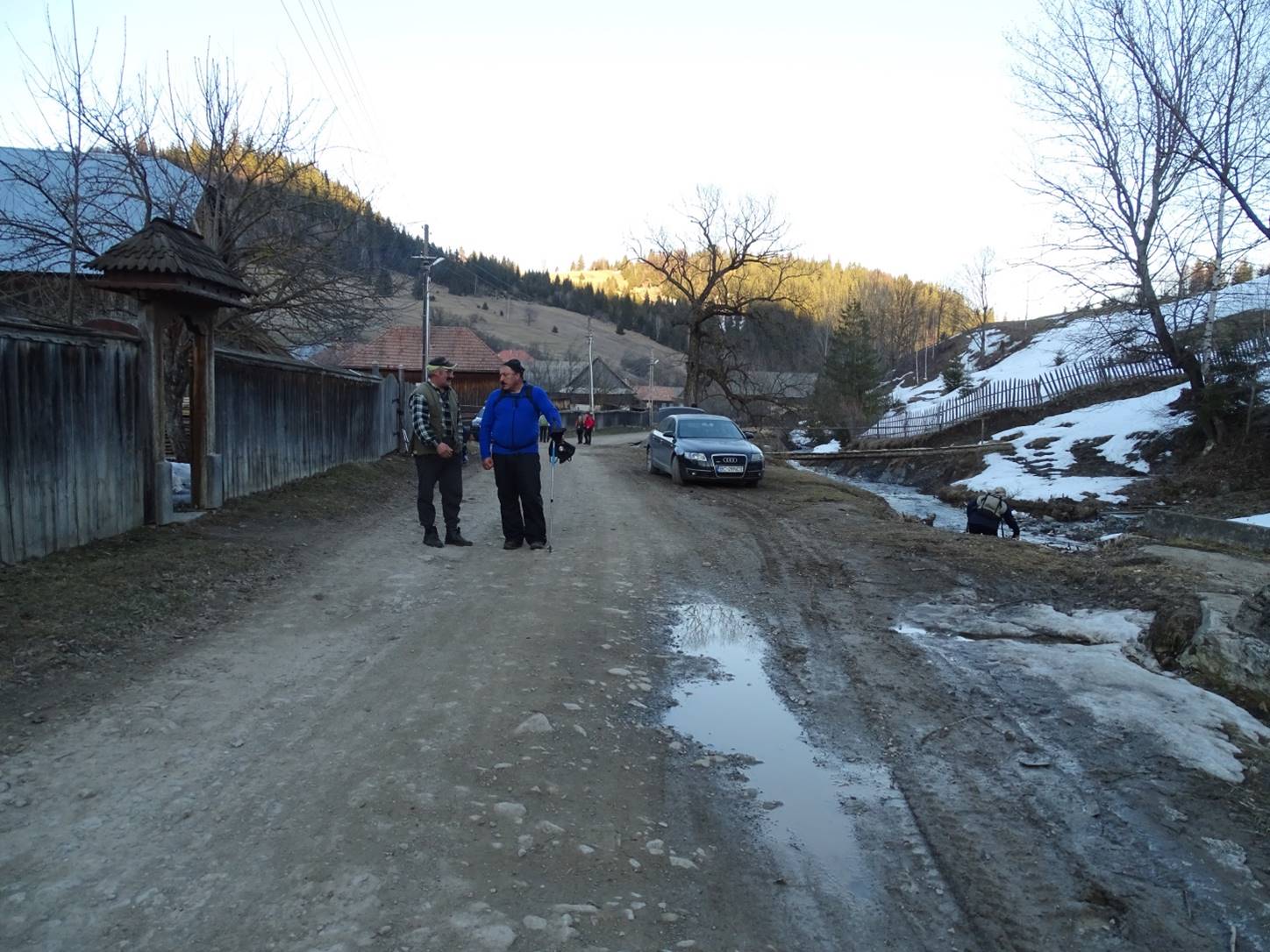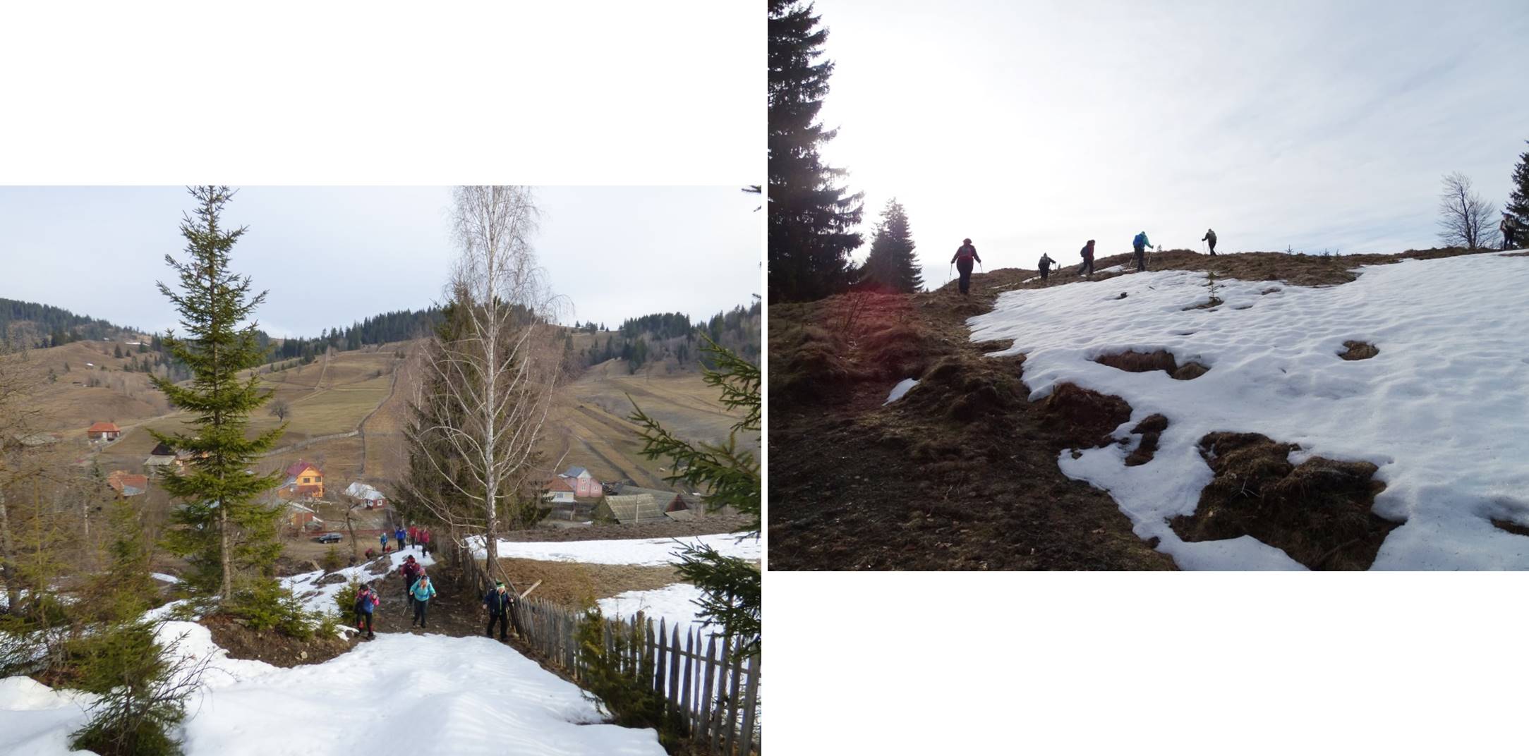 Dar primăvară e și mai jos: urmăm drumul de căruțe ce coboară printr-un pâlc de pădure, dincolo de care cotim drastic, cu 90 de grade spre dreapta.