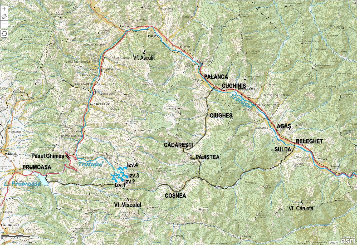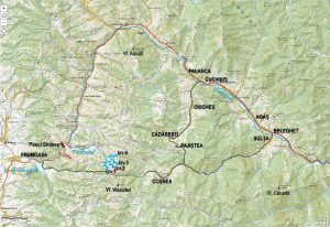 … de pe care cotim spre dreapta trecând pe deasupra câtorva dintre izvoarele Comiatului – primul afluent mai serios al Trotușului.