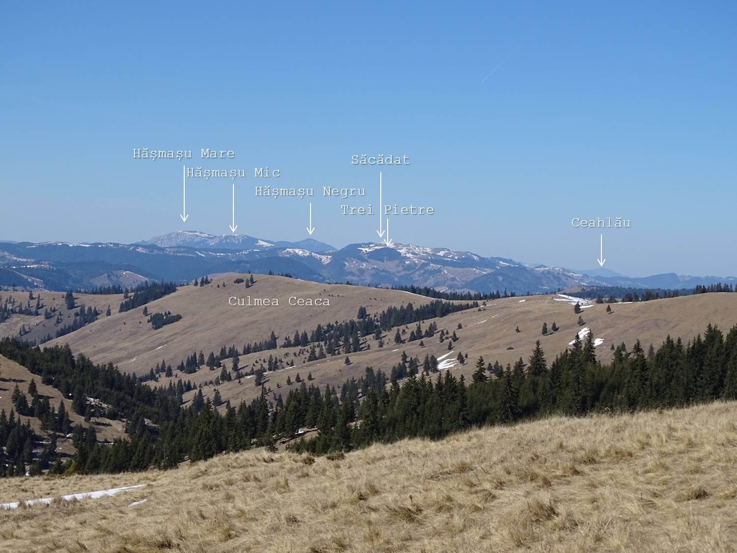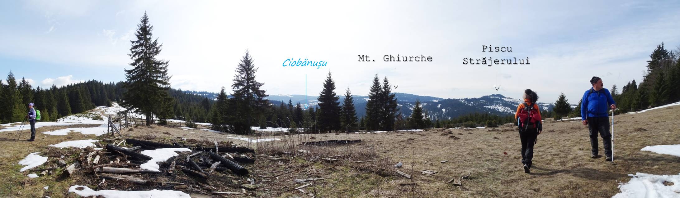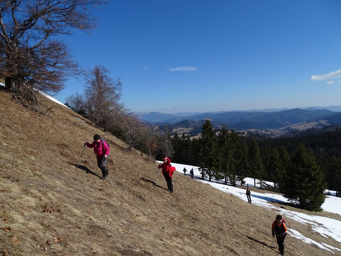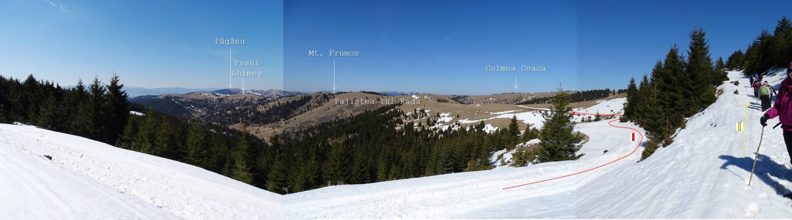 … tăindu-i coastele pieziș, după ce părăsim marcajul bandă roșie care, pe culmea principală a Munților Ciucului, ajunge în Pasul Ghimeș.