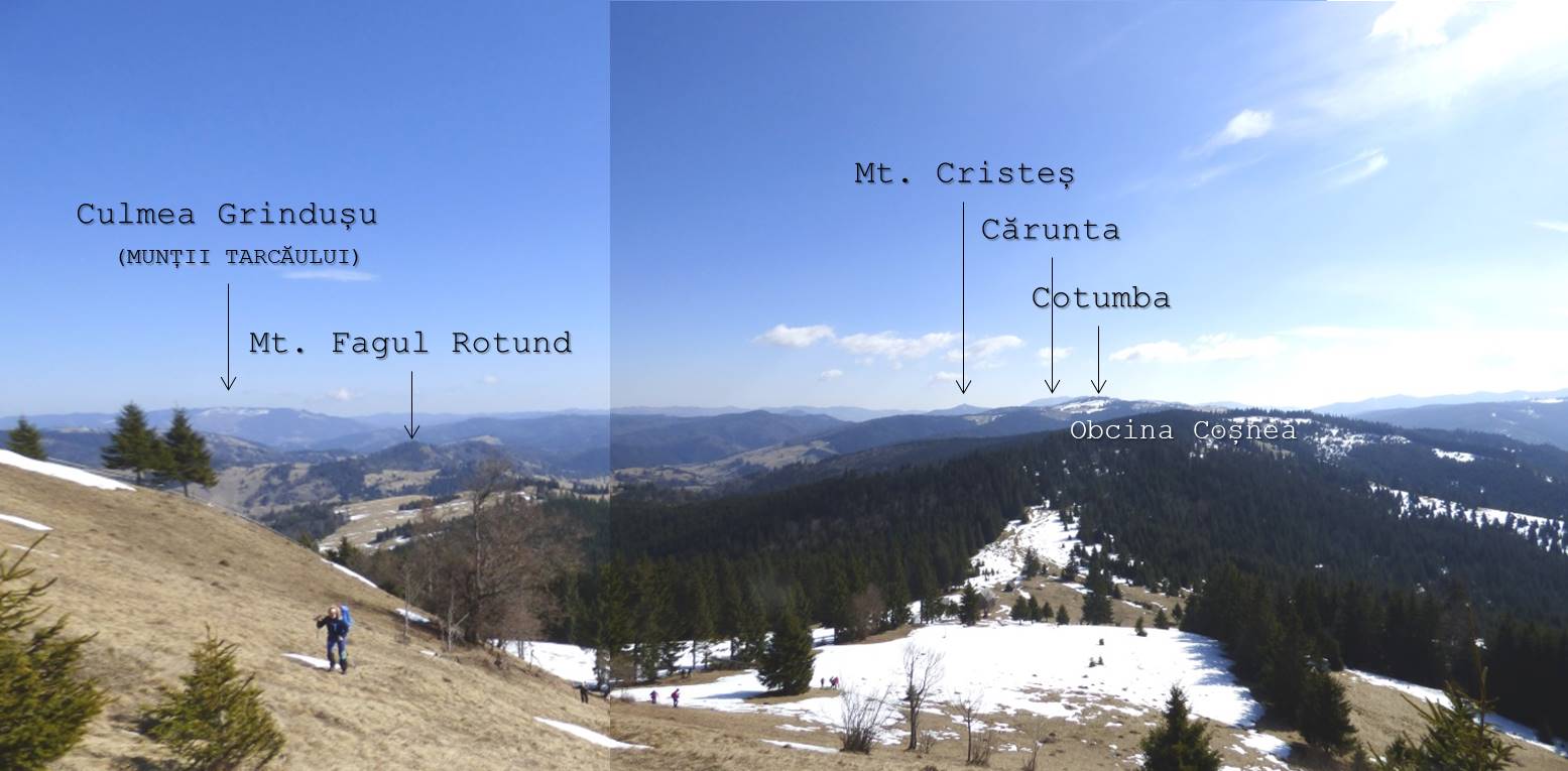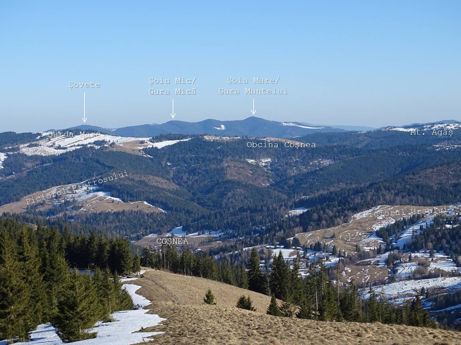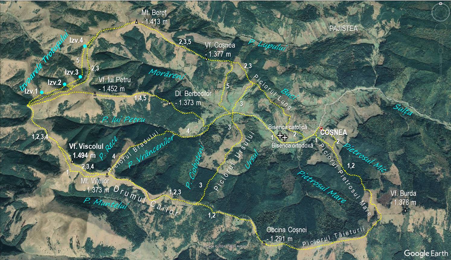 1. Coșnea – Piciorul Pietrosul Mare – Culmea Tăieturii – Obcina Coșnea – Drumul Cailor – Mt. Vițeilor – Mt. Viscolul – Mt. lui Petru – Dl. Berbecilor – Coșnea
