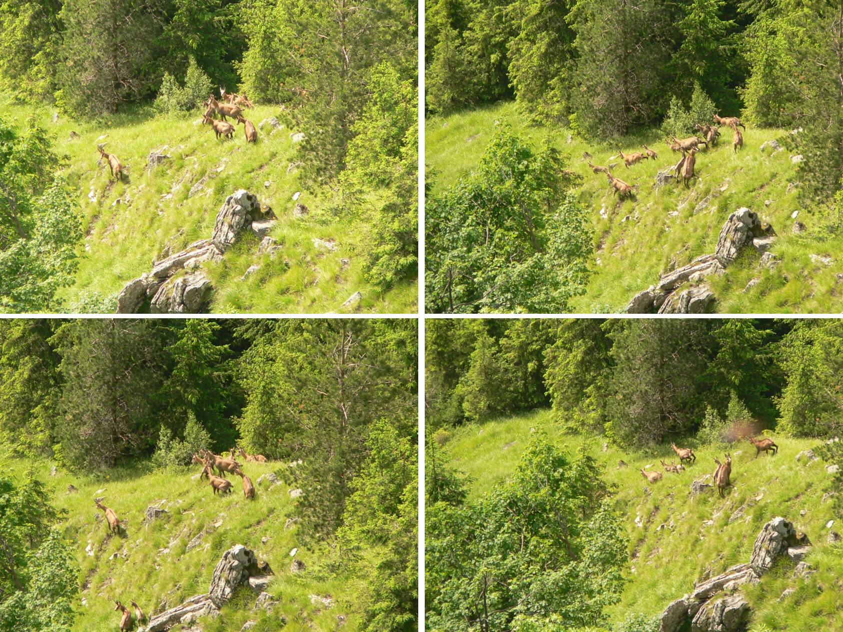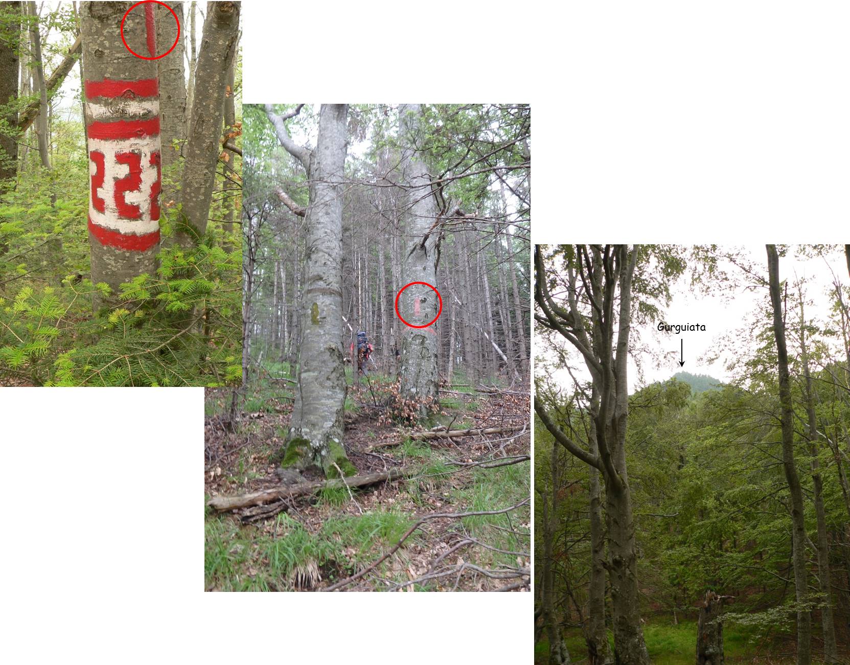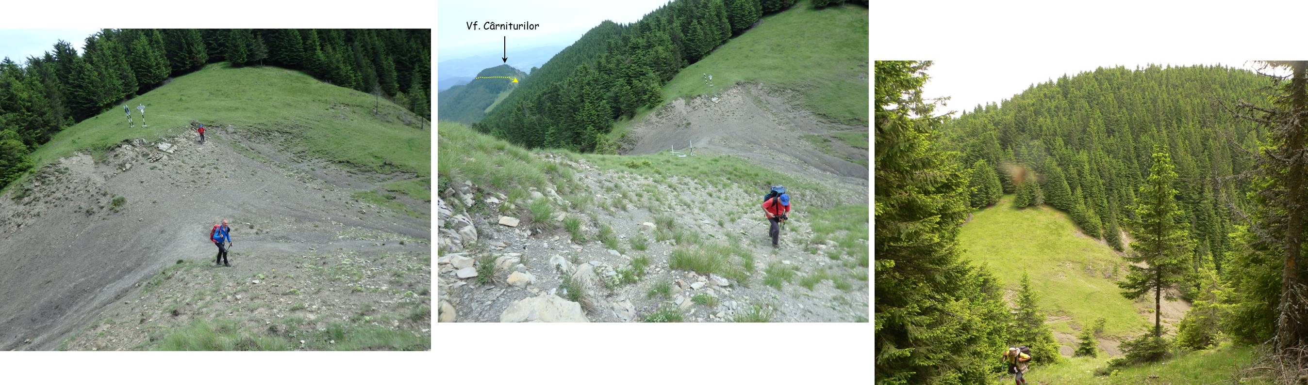 Cum ați intuit, am mers pe creastă și dincolo de vârf, coborând chiar o porțiune, pentru a vedea în ce fel putem coborî în Tișița Mare. Strict pe linia morfologică a masivului nu se poate din cauza unei ruperi de pantă ce apare după cica 1/4 din abruptul final al Gurguiatei (Foto 1, pe mail !). O coborâre relativ facilă am remarcat-o pe un picior lateral cu terminația la confluența Gurguiata-Tișița Mare (Foto 1). În Foto2 și Foto 3 (pe mail) se poate vedea ceva din acest picior (pe care se aflau caprele negre ce apar în fotoreportaj).