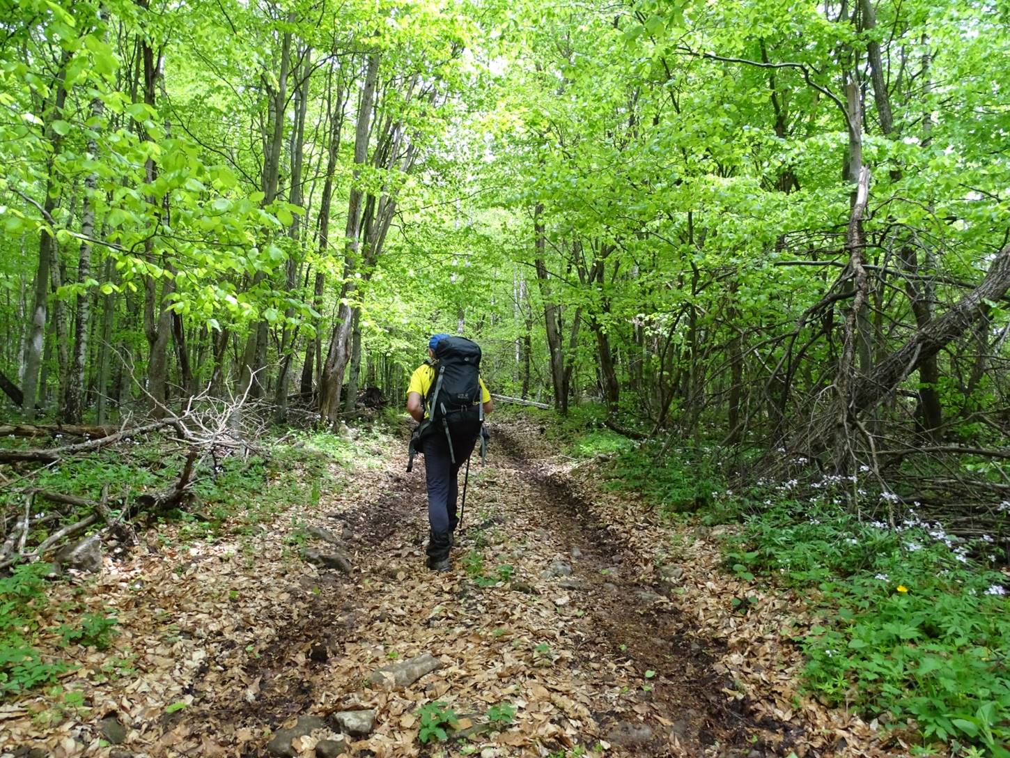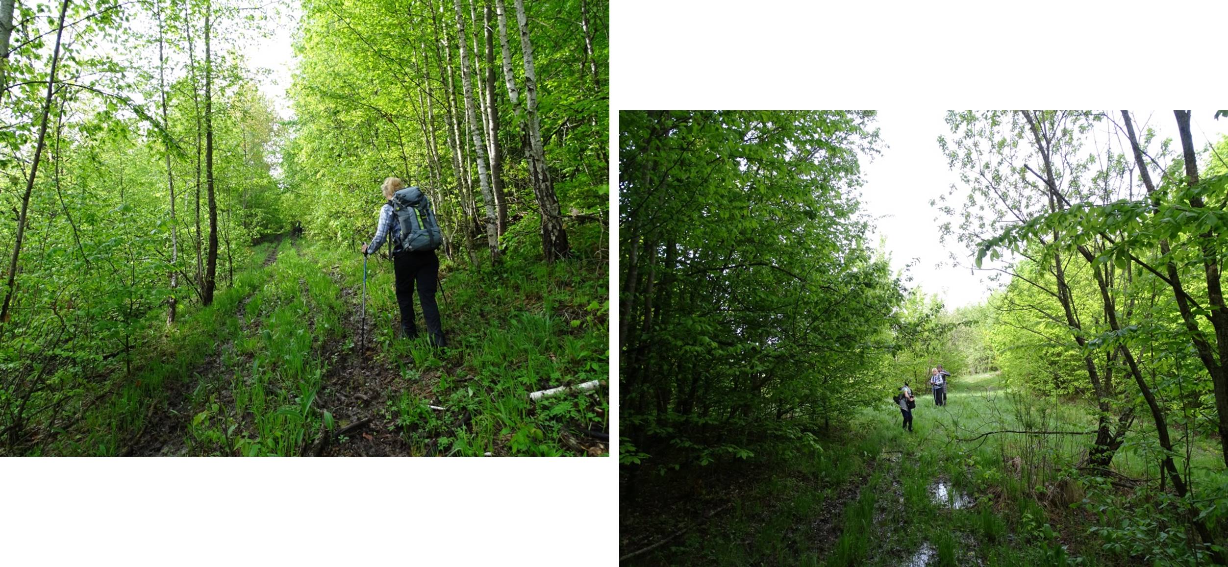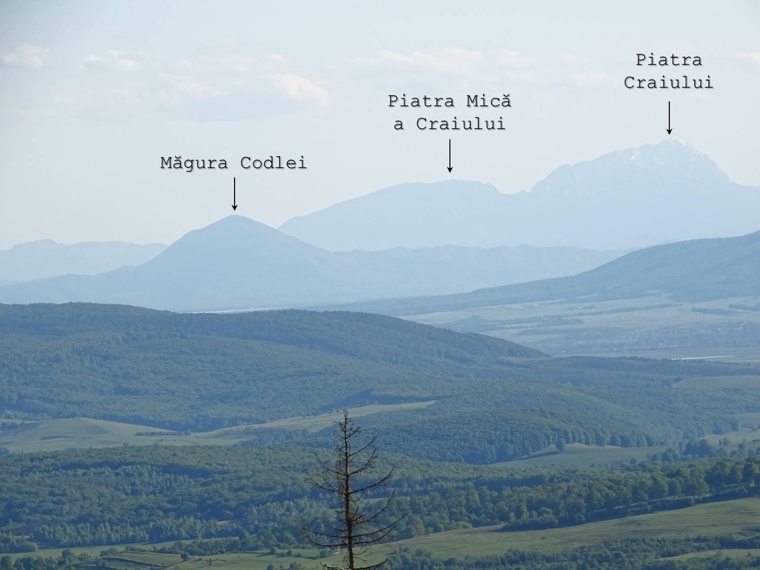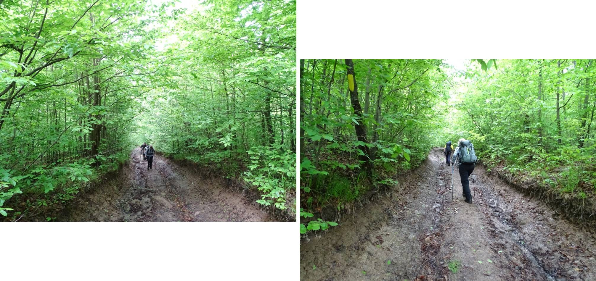 De pe vârf coborâm, spre vest, pe muchia unui picior al său până ce ieșim la marginea unei uriașe defrișări. Ne ținem de marginea pădurii, urmând un drum de tractor …
