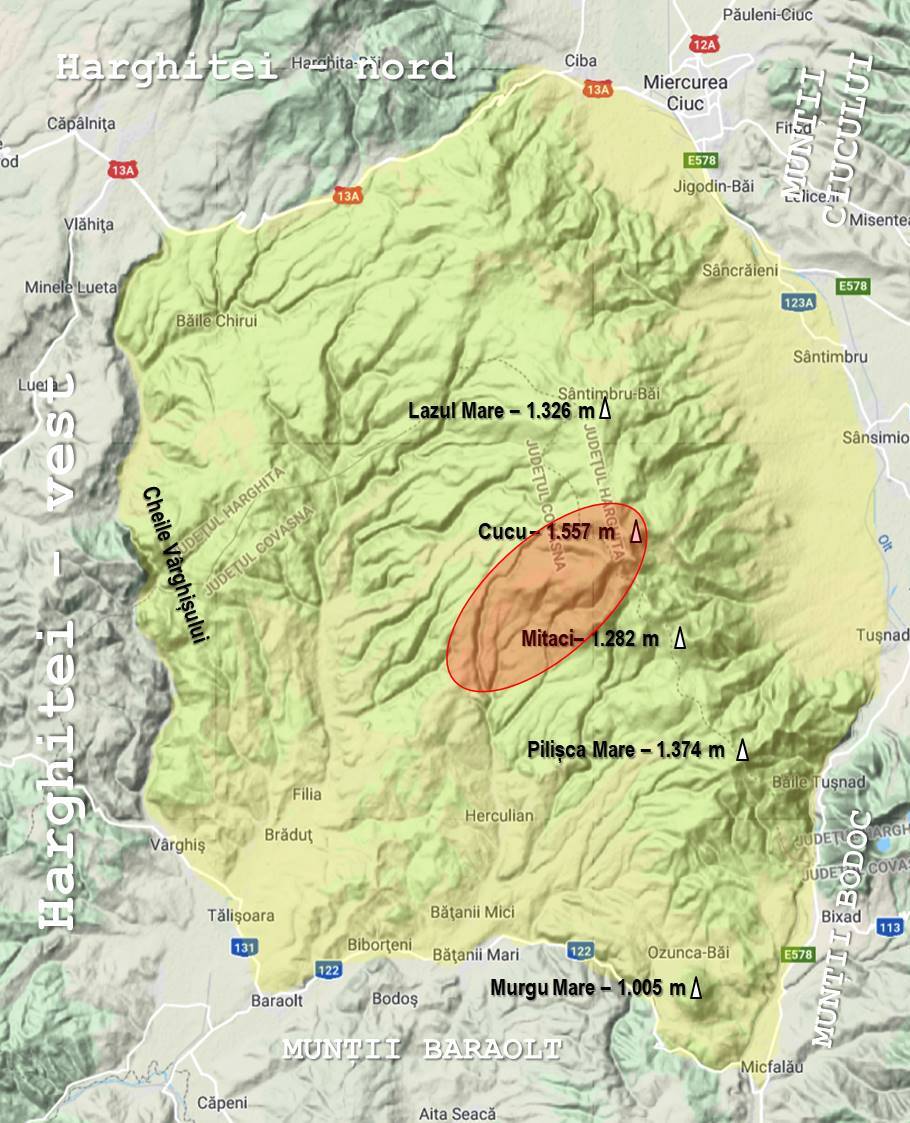 Munții Harghitei sunt, de regulă, prezentați, de fapt, reprezentați doar de culmea lor principală, lungă de vreo 70 km. Schița de hartă alăturată sugerează complexitatea morfologică a acestor munți, cauzată de lungile culmi secundare de pe versantul vestic al culmii principale. Motiv pentru care, din rațiuni de simplificare a sistematizării traseelor turistice am împărțit suprafața muntoasă în cauză în cele trei sectoare consemnate pe hartă.